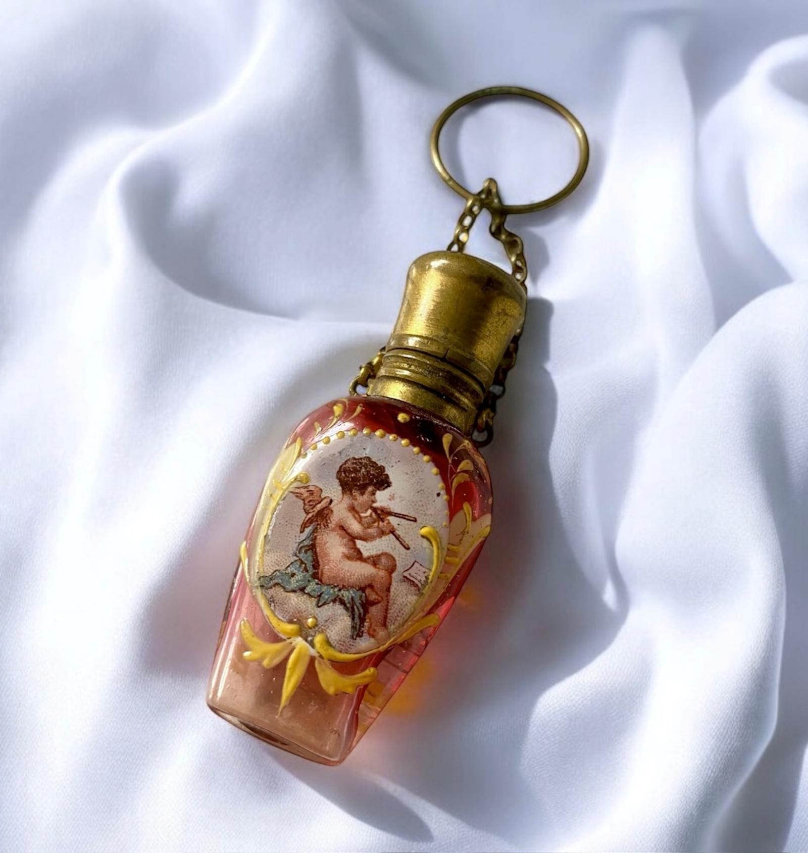 Antique Chatelaine Perfume Scent Bottle Enamelled Cranberry Glass with Cherub c.1880