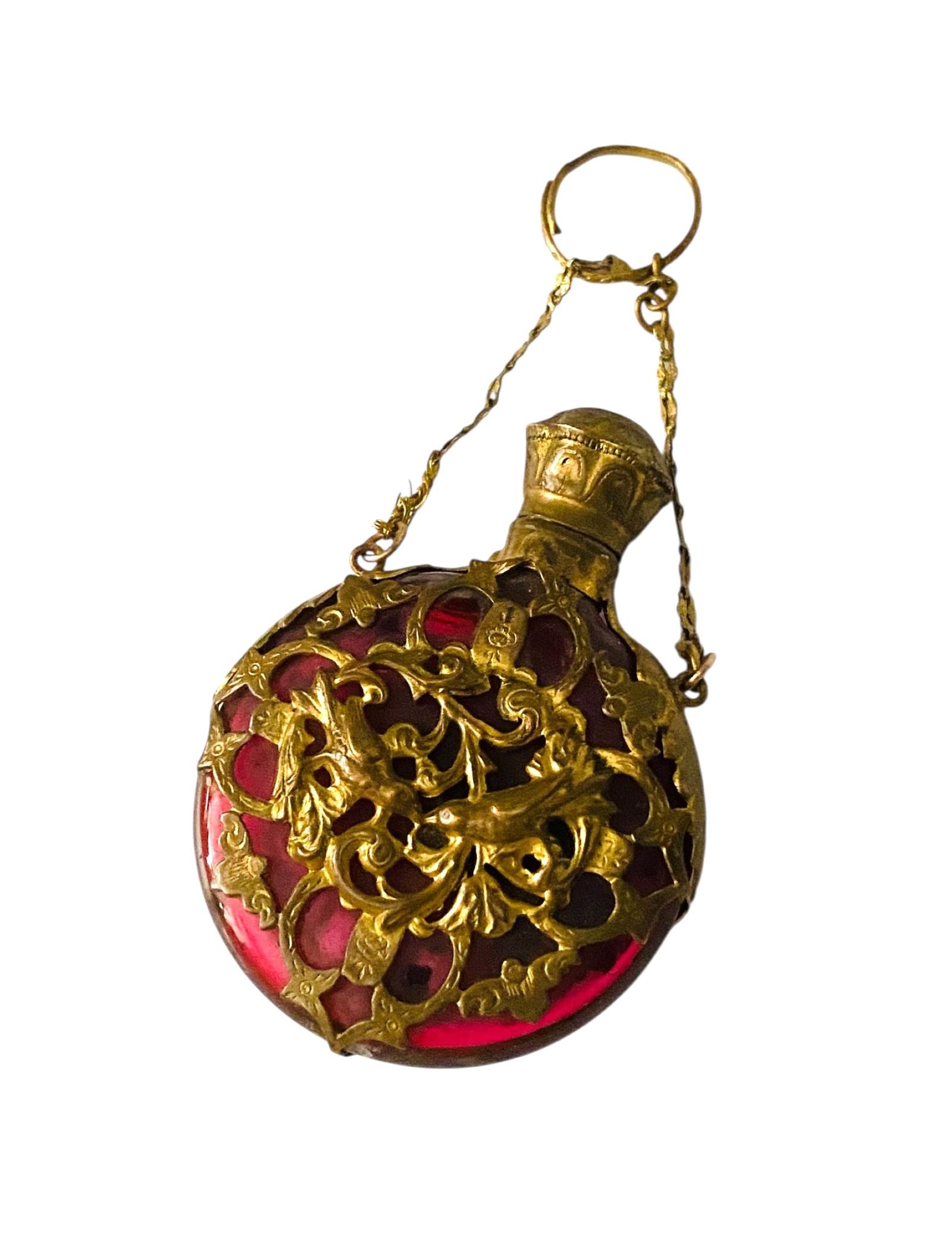 This scent bottle is made of beautiful ruby red glass with lovely decorative pierced gilt metal ormolu mount encasing the glass and featuring kissing doves to the front and verso. The bottle has a hinged scalloped lid with engraved top and attached to the sides of the mount is a suspensory chain and ring so that the bottle could be hung from a chain or chatelaine. The bottle has the original clear glass inner stopper.