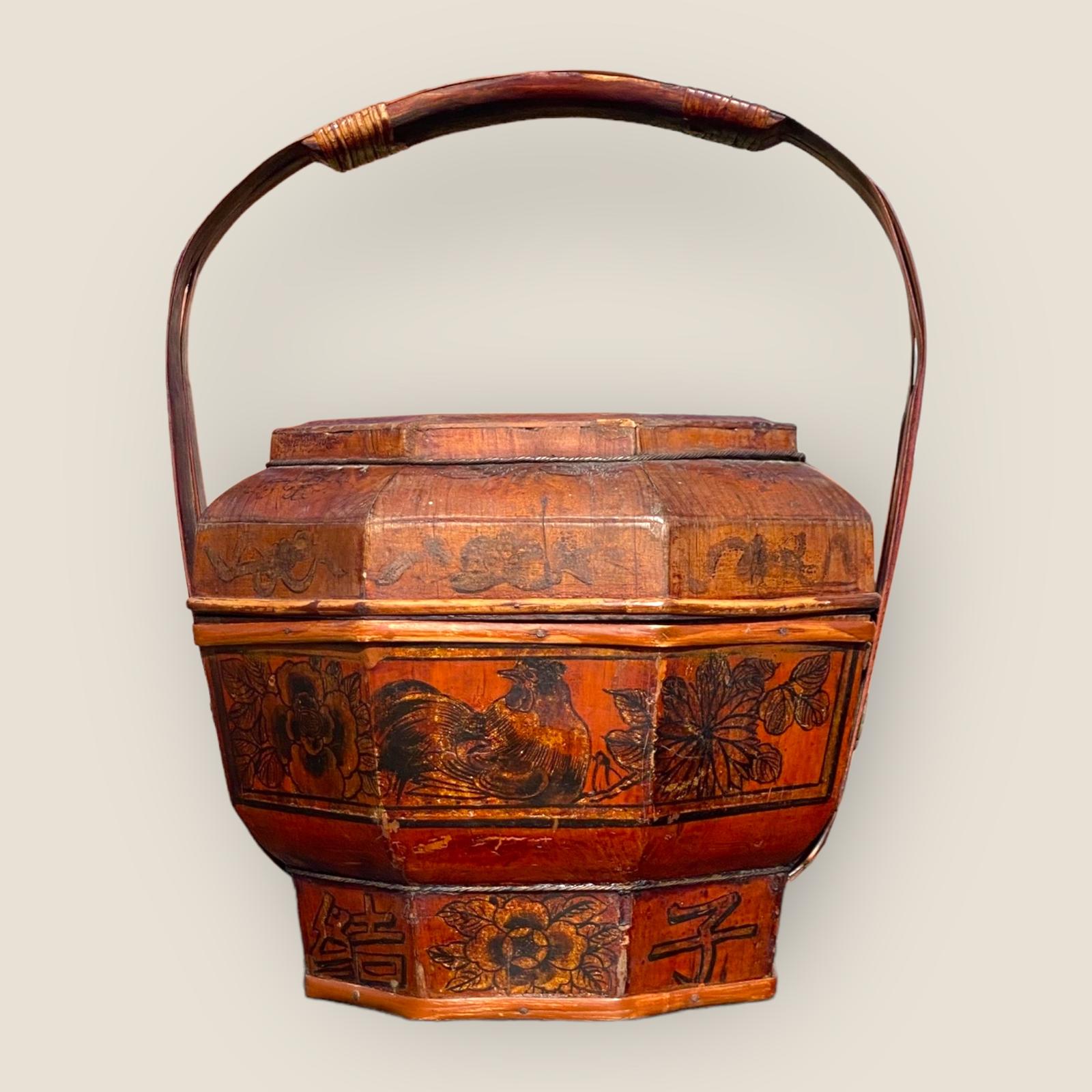 Antique Chinese Bamboo & Lacquer Wood Wedding Basket