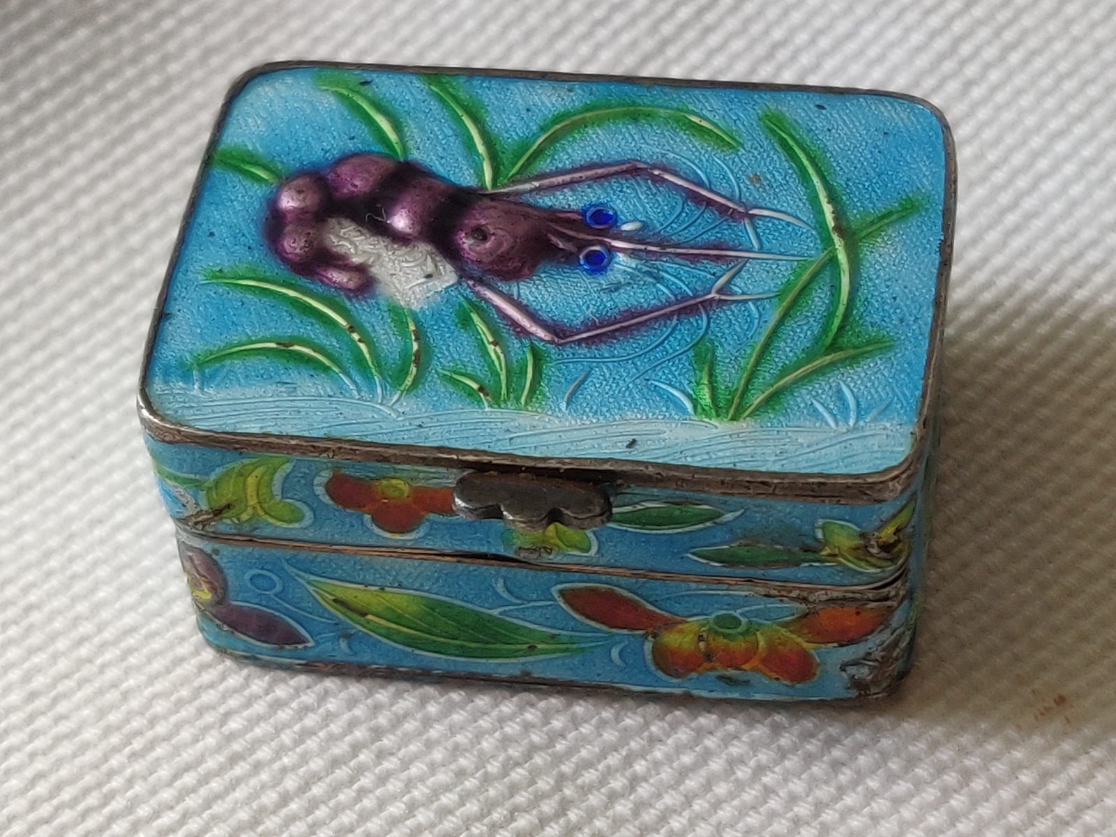Antique Chinese Enamel Solid Silver Pill Box with Shrimp