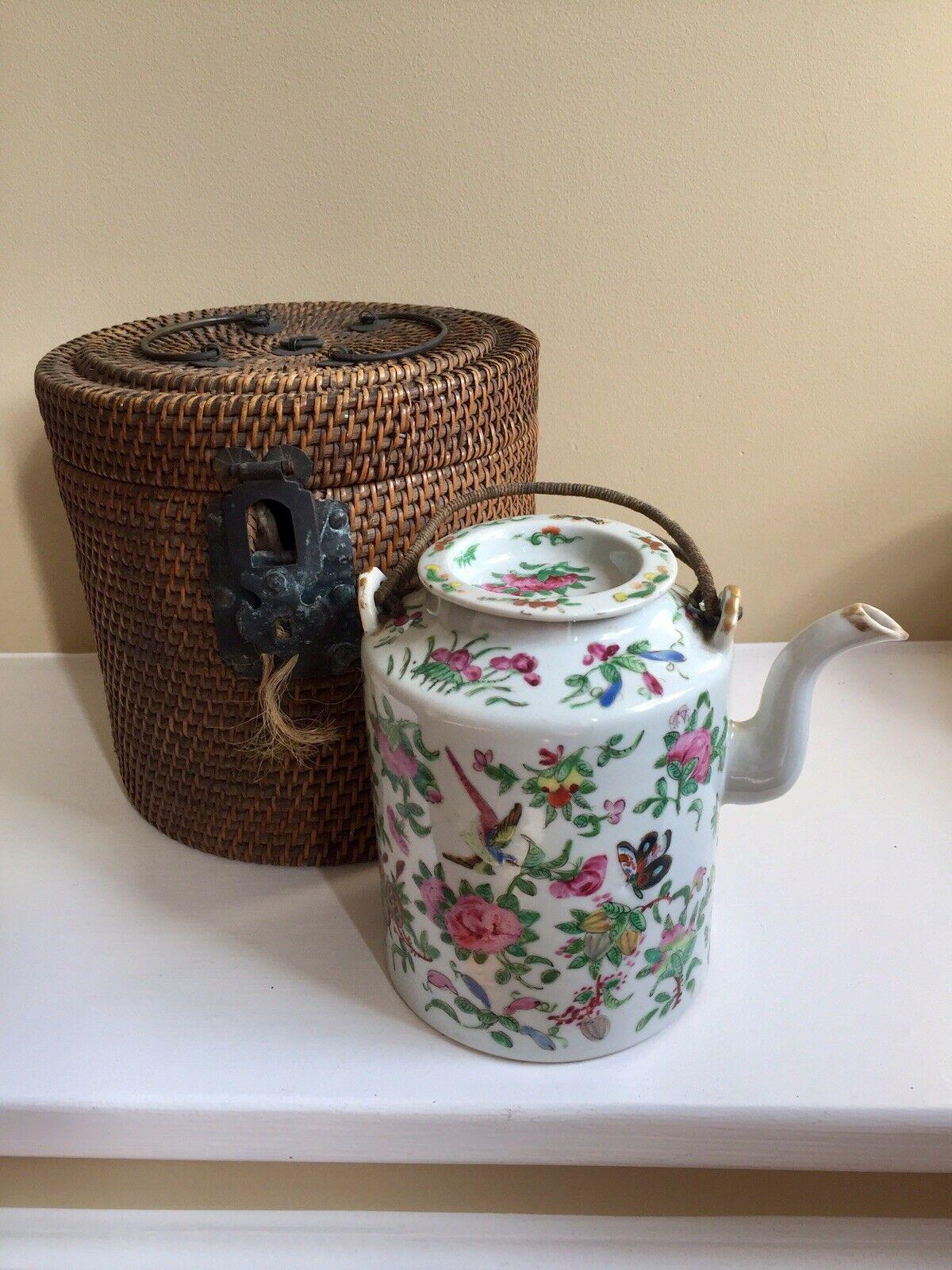 Antique Chinese Famile Rose Porcelain Teapot In Insulated Wicker Carry Case