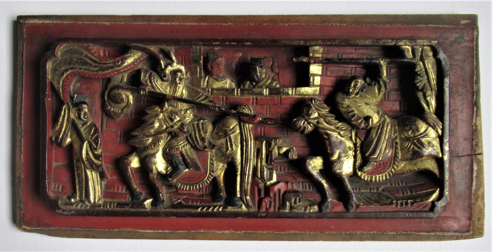 Antique Chinese giltwood carved panel, 19th century, jousting/duel