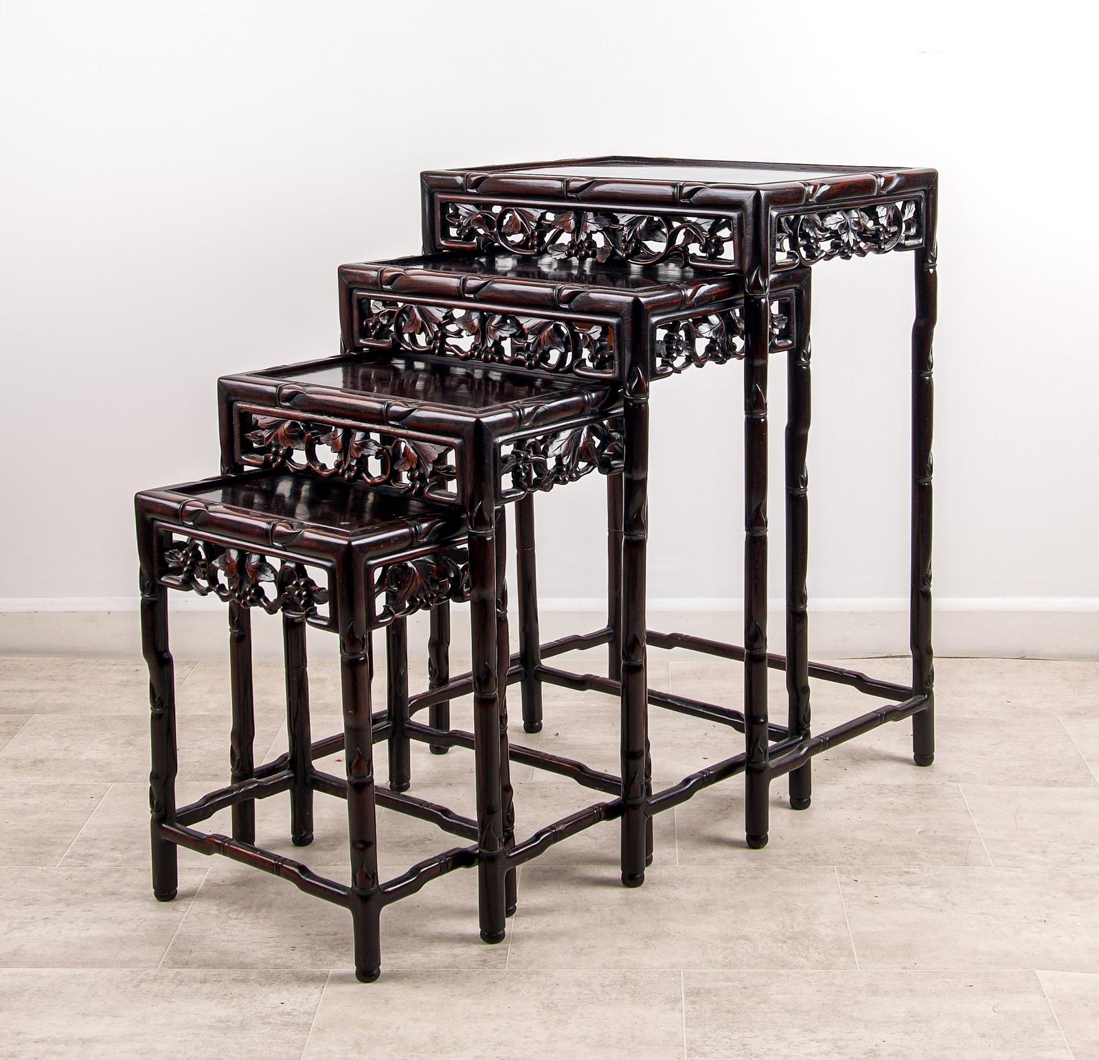 Each table features intricately carved panels with scrolling foliage and bamboo-form legs, giving the set a refined and decorative presence. The graduated design allows the tables to neatly stack together when not in use, while also providing versatile functionality as side tables, lamp tables, or occasional tables.