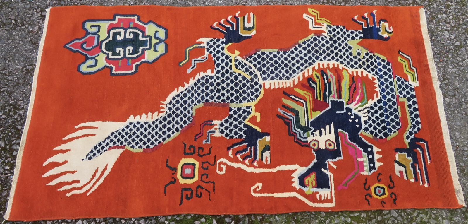 Antique Chinese Tibetan Dragon Rug - Imperial 5 Claw Dragon Chasing Flaming Pearl