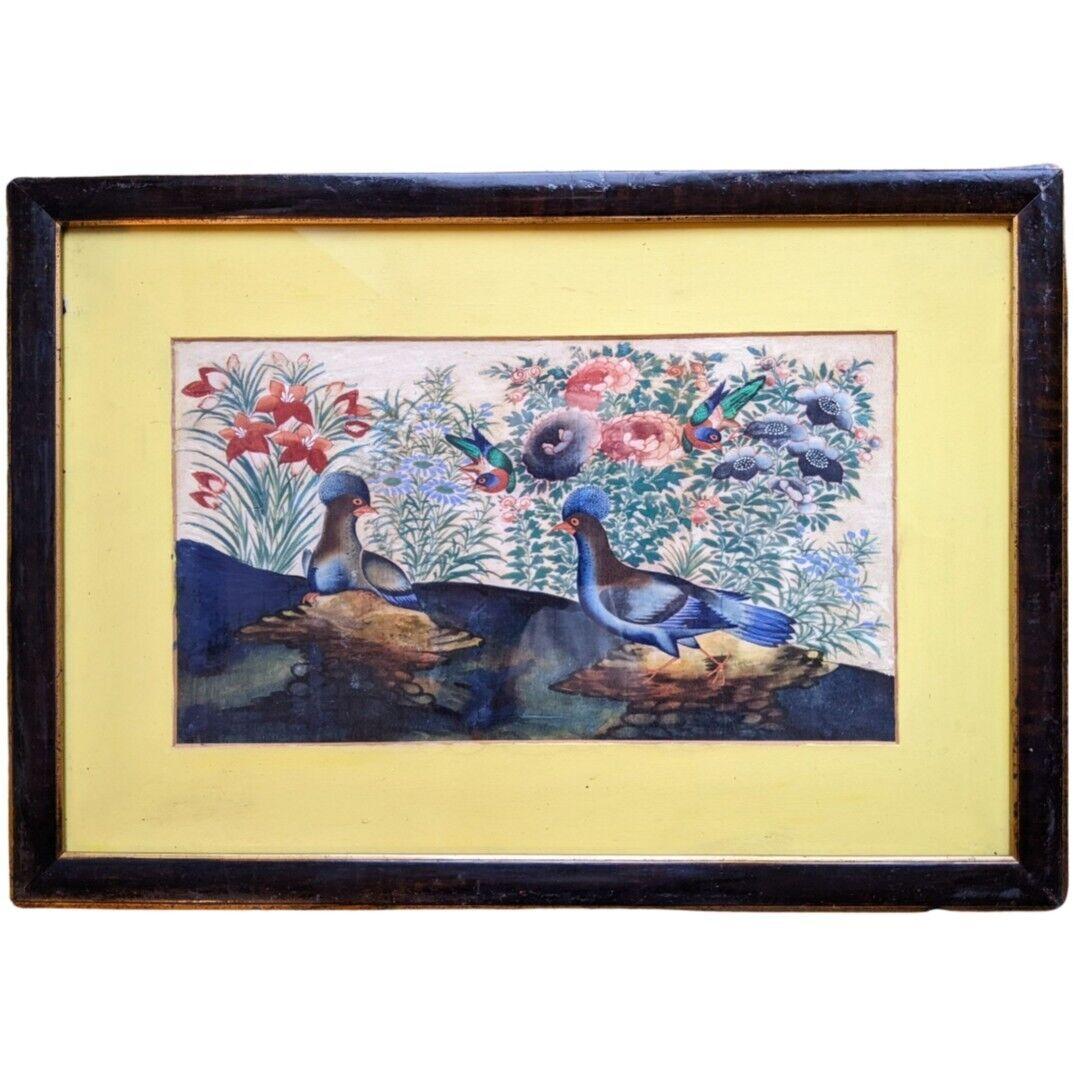 Antique Chinese Watercolour Painting Crested Pigeons 19th Century