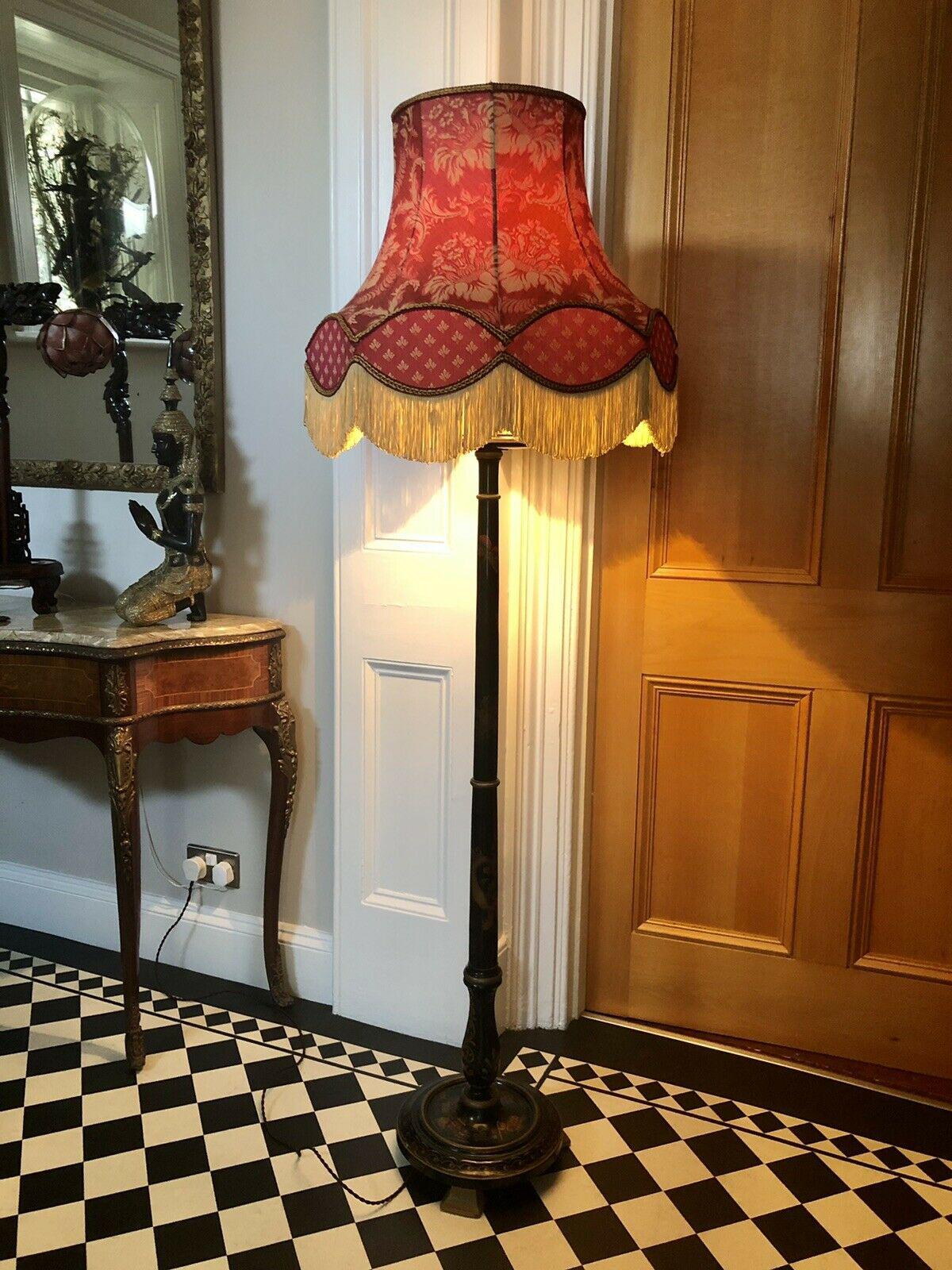 Antique Chinoiserie Black Lacquered, Hand Painted Floor Lamp with Shade