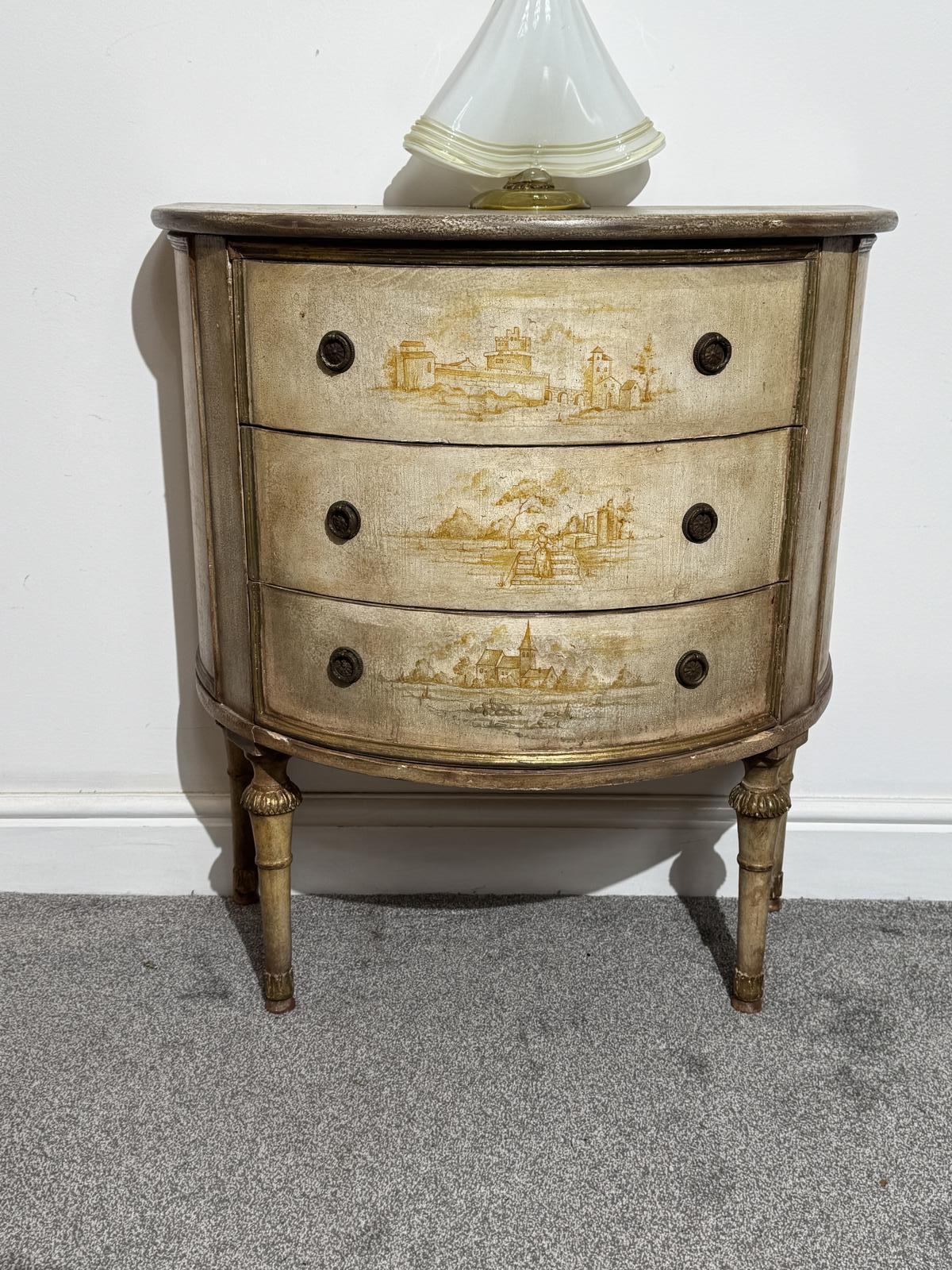 This is an antique continental three-drawer chest, dating from the 19th century. The chest is painted with rural scenes on each drawer and the front of each side panel with turned legs and gilt decoration on the top and bottom of each leg. It is in original untouched condition with age related wear.