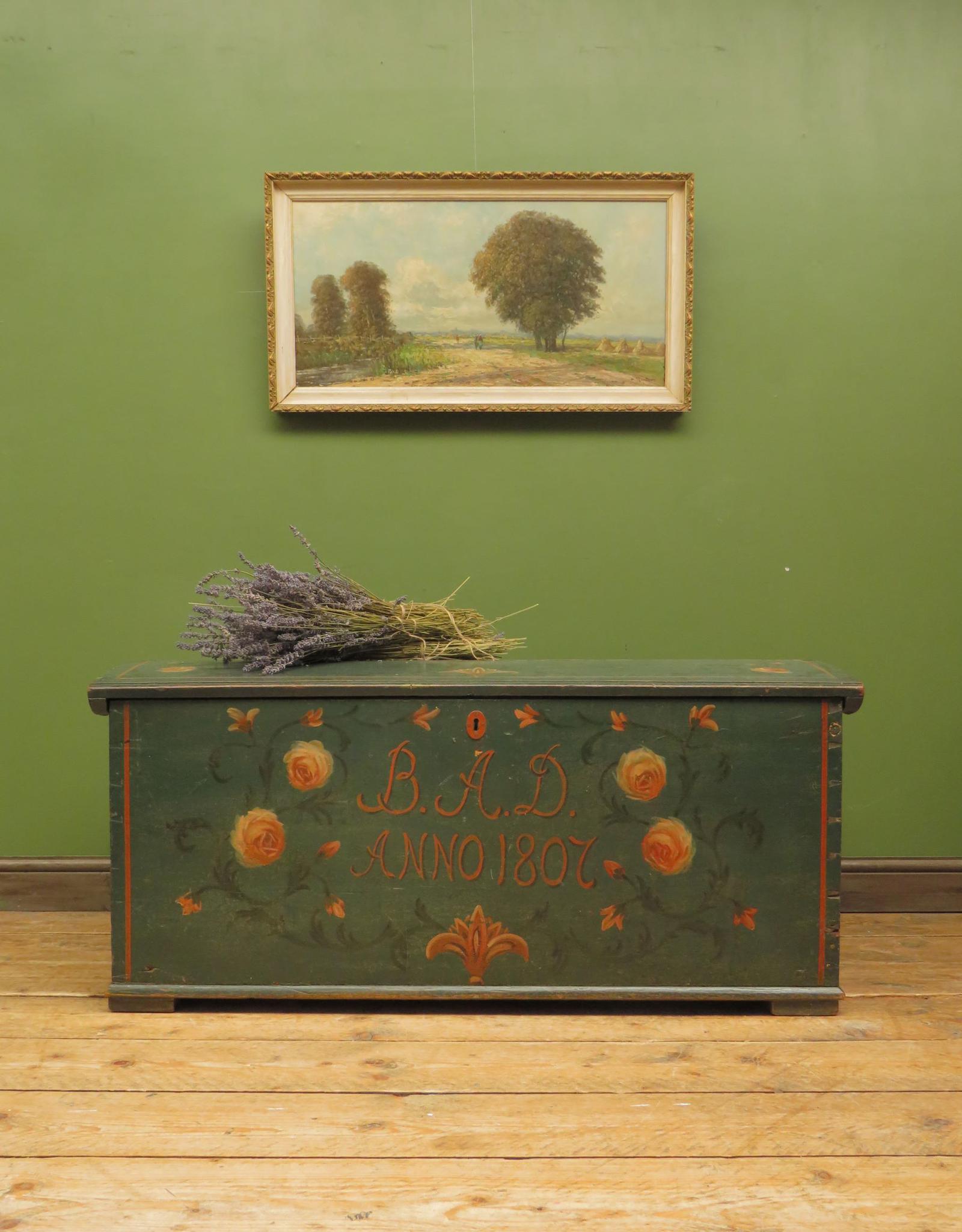 Antique Continental Painted Folk Art Coffer with Dome Top, Blanket Box