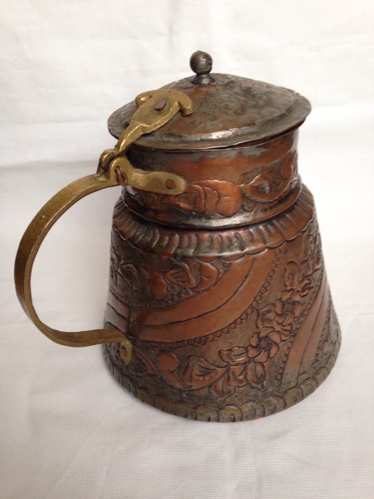 Antique Copper Primitive Decorated with an Embossed Pattern Hammered Folk Art Water Pitcher with Lid