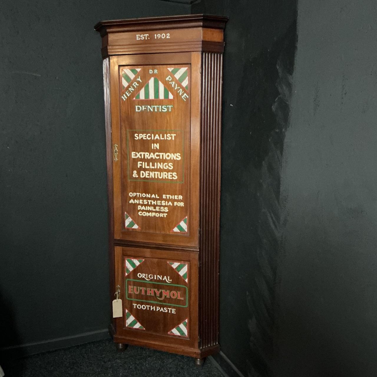 Antique corner cupboard from the Edwardian period made from solid Walnut with later sign written decoration of a dental nature. A well made piece of furniture, with wonderful deep reeding to both sides , ogee cornice and turned feet. Internally it still retains it's original paint and offers great storage. Both locks working with keys. A real conversation piece, ready to use. SKU-G31