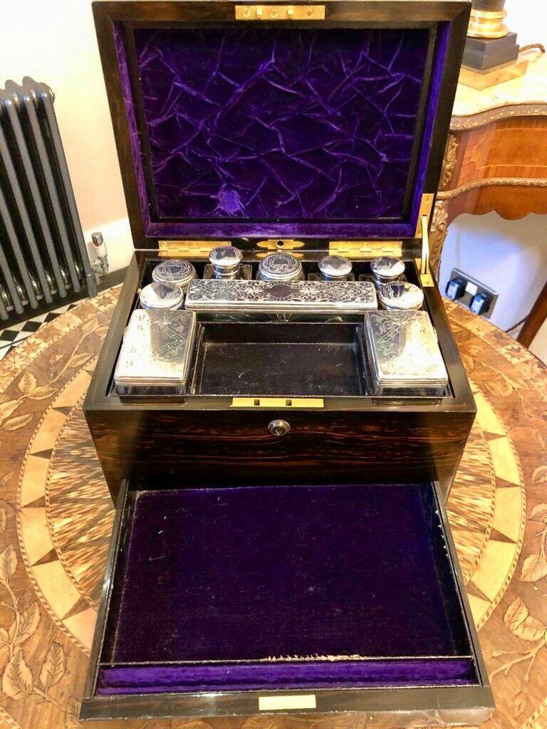 Antique Coromandel Dressing Box With Bottles, Bramah Lock, Secret Drawer