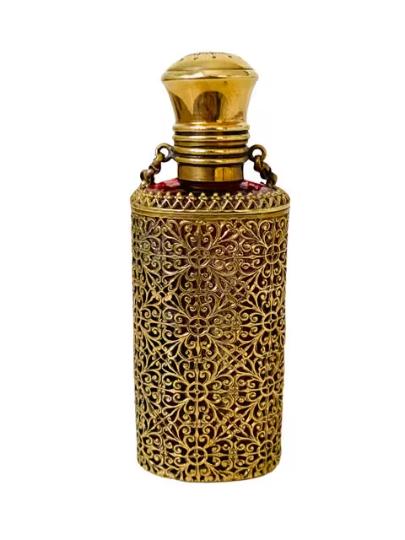 Antique Cranberry Glass Gilt Ormolu Mounted Chatelaine Perfume Scent Bottle c.1880