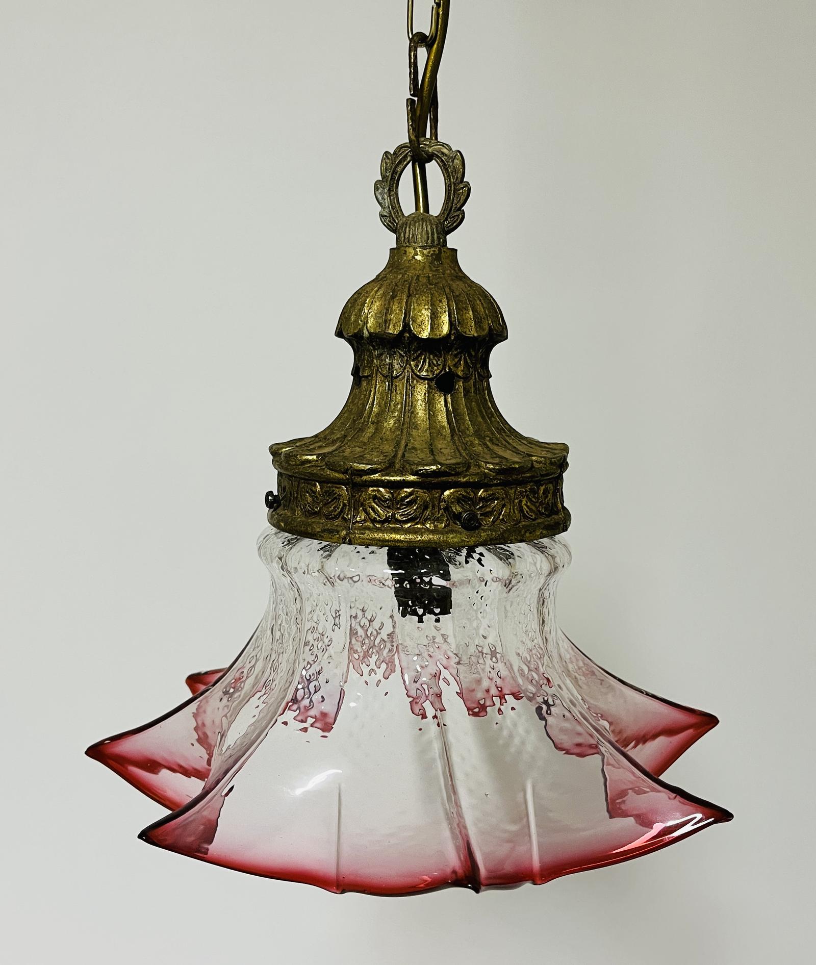 A beautiful glass pendant light dating from the early 20th Century . The shade has a wide flared rim with a cranberry glass edge and it has a good quality cast brass gallery.