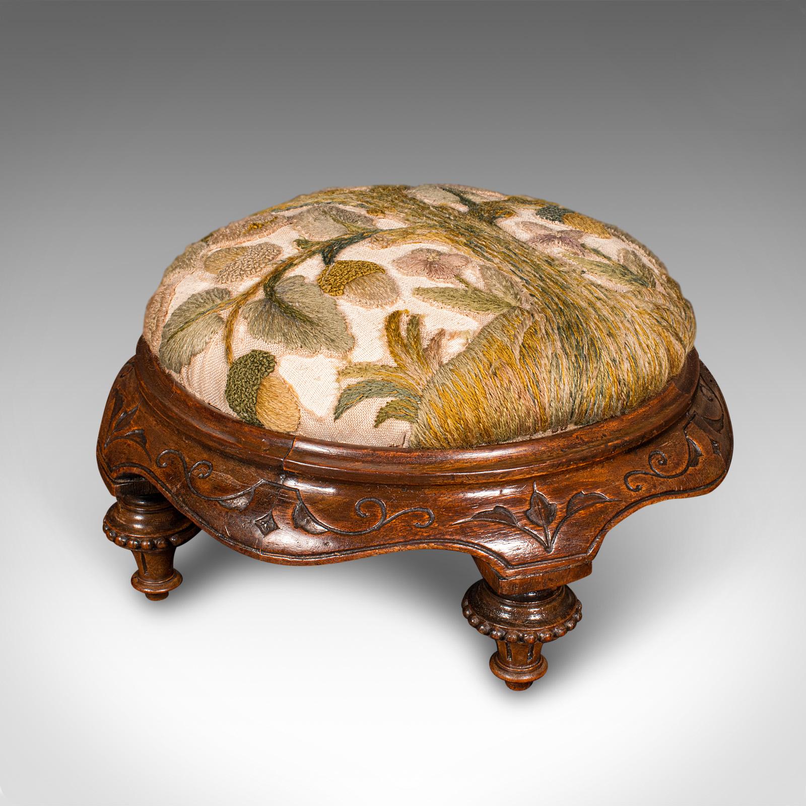 Antique Crewel Work Foot Stool, English, Walnut, Embroidery, Stool - Victorian