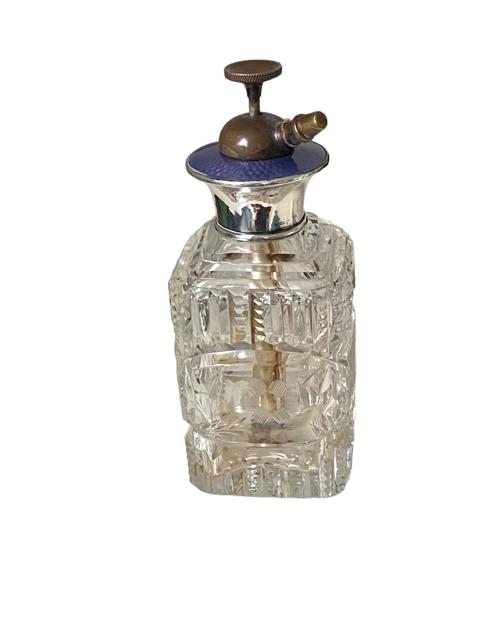 Antique Cut Glass Perfume Scent Atomiser Bottle with Silver & Guilloche Enamel Collar c.1915