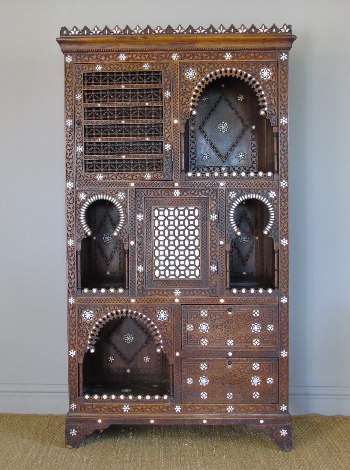 Antique Damascus Inlaid Hardwood Cabinet Mother of Pearl 19th Century