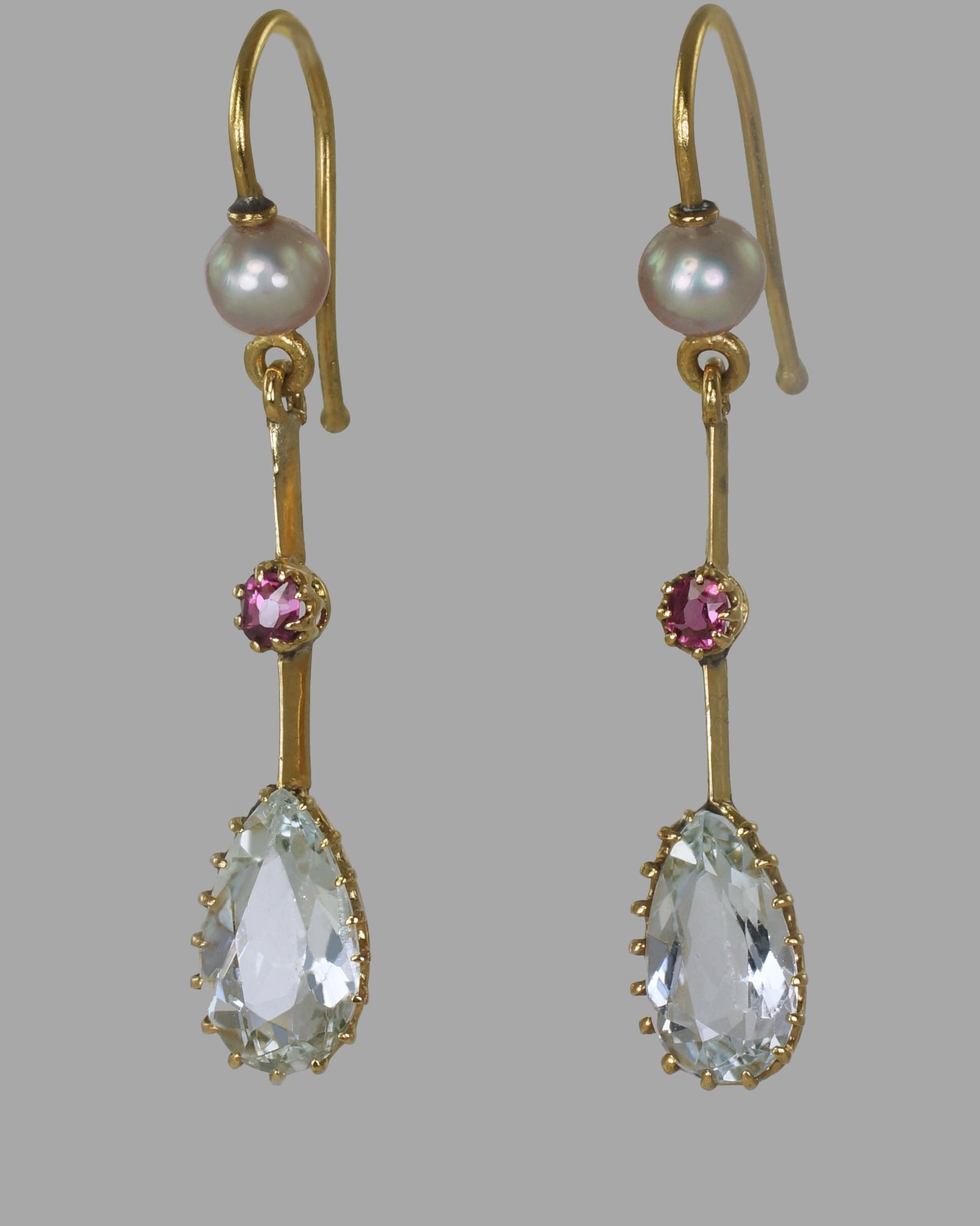 Antique Dangle Earrings 18ct Gold Aquamarine Ruby Pearl Edwardian Drop Earrings