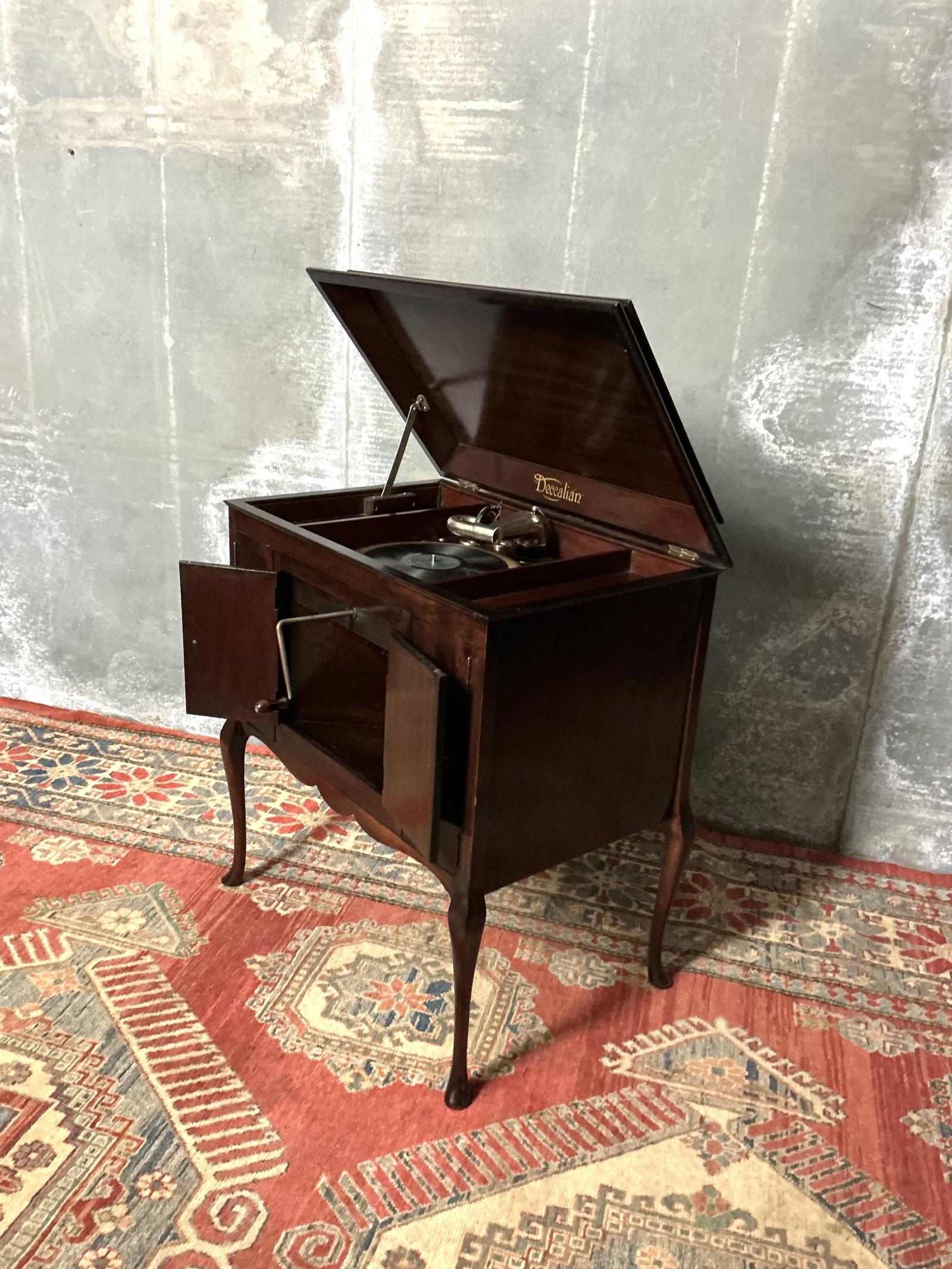 This is a DECCALIAN wind up gramophone set in a elegant newly re polished Mahogany cabinet. The mechanism is working as it should and will provide hours of fun and surprises at some of the catchy tunes from the past. All ready to use and enjoy. SKU-G5