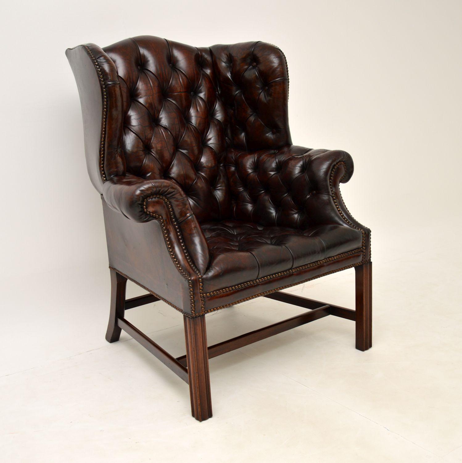 Antique Deep Buttoned Leather Wing Back Armchair