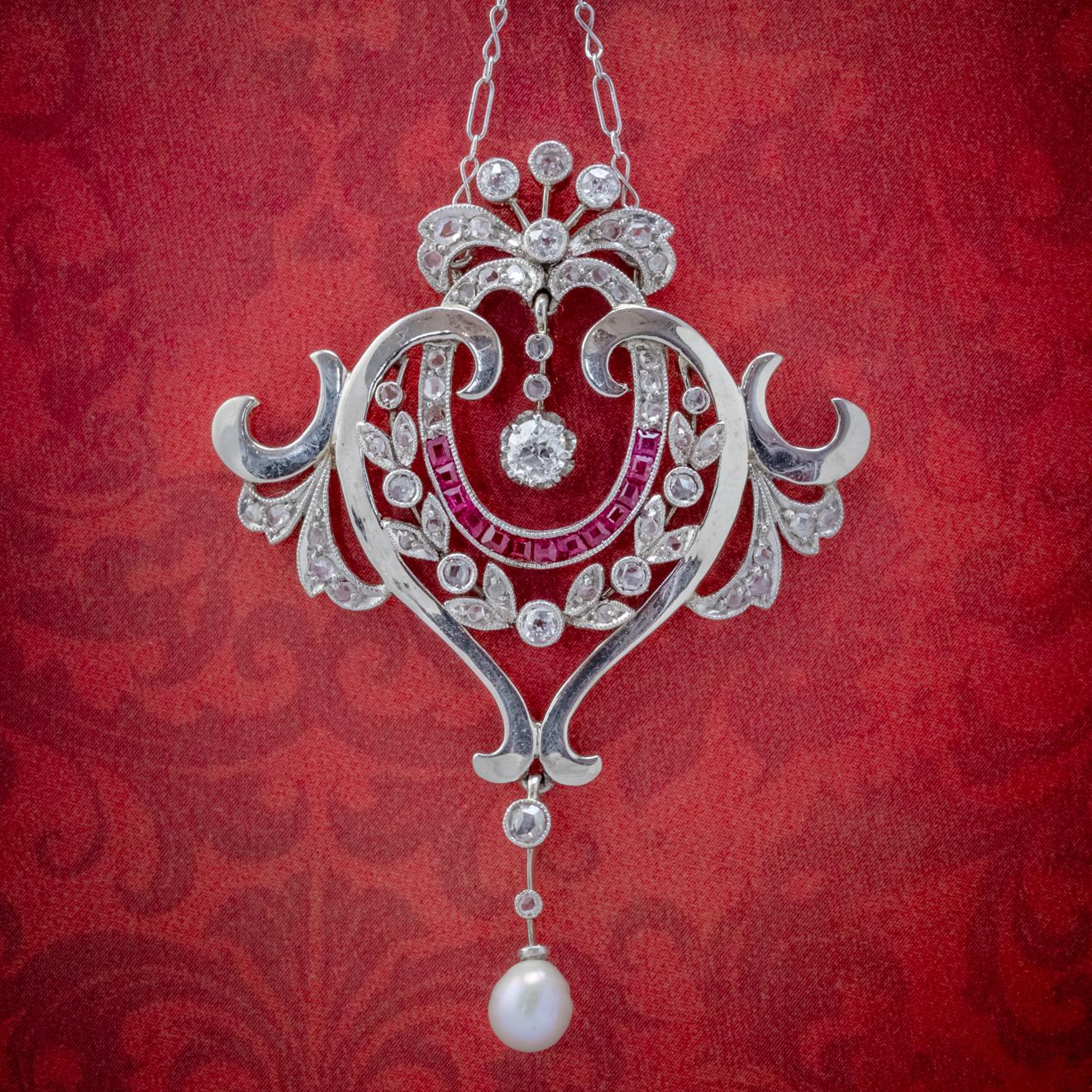 Antique Diamond Ruby Pearl Pendant Necklace Platinum 18ct Gold c.1915 Boxed