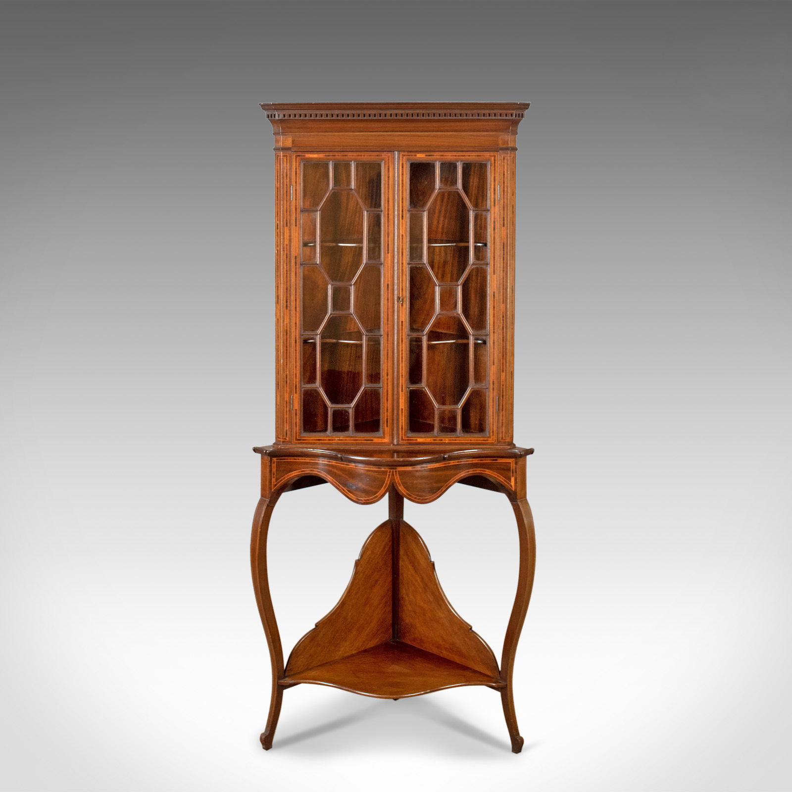 Antique Display Cabinet on Stand, English, Edwardian, Glazed, Mahogany, Corner
