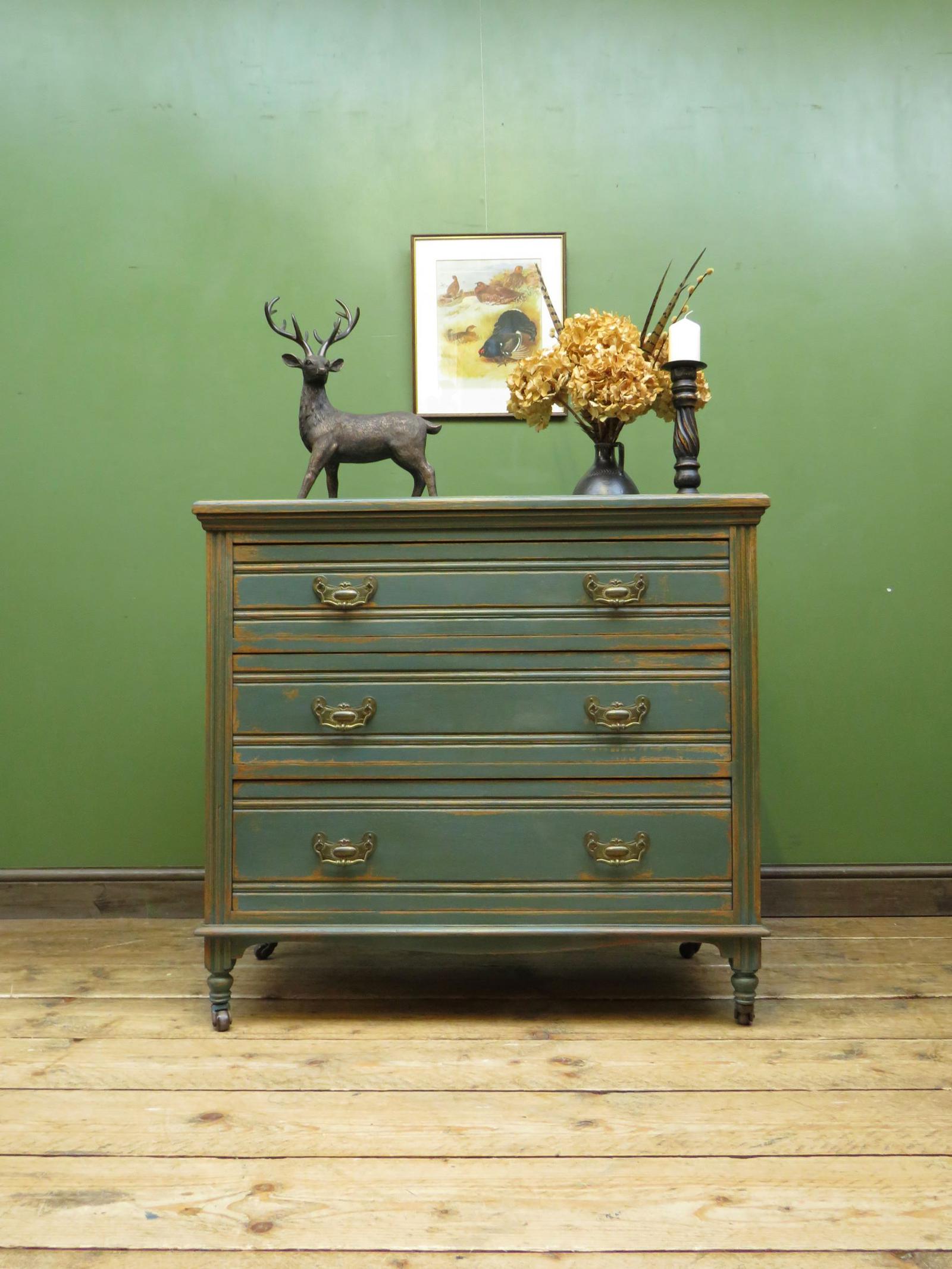 Antique Dusky Blue Painted Chest of Drawers with Ornate Brass Handles