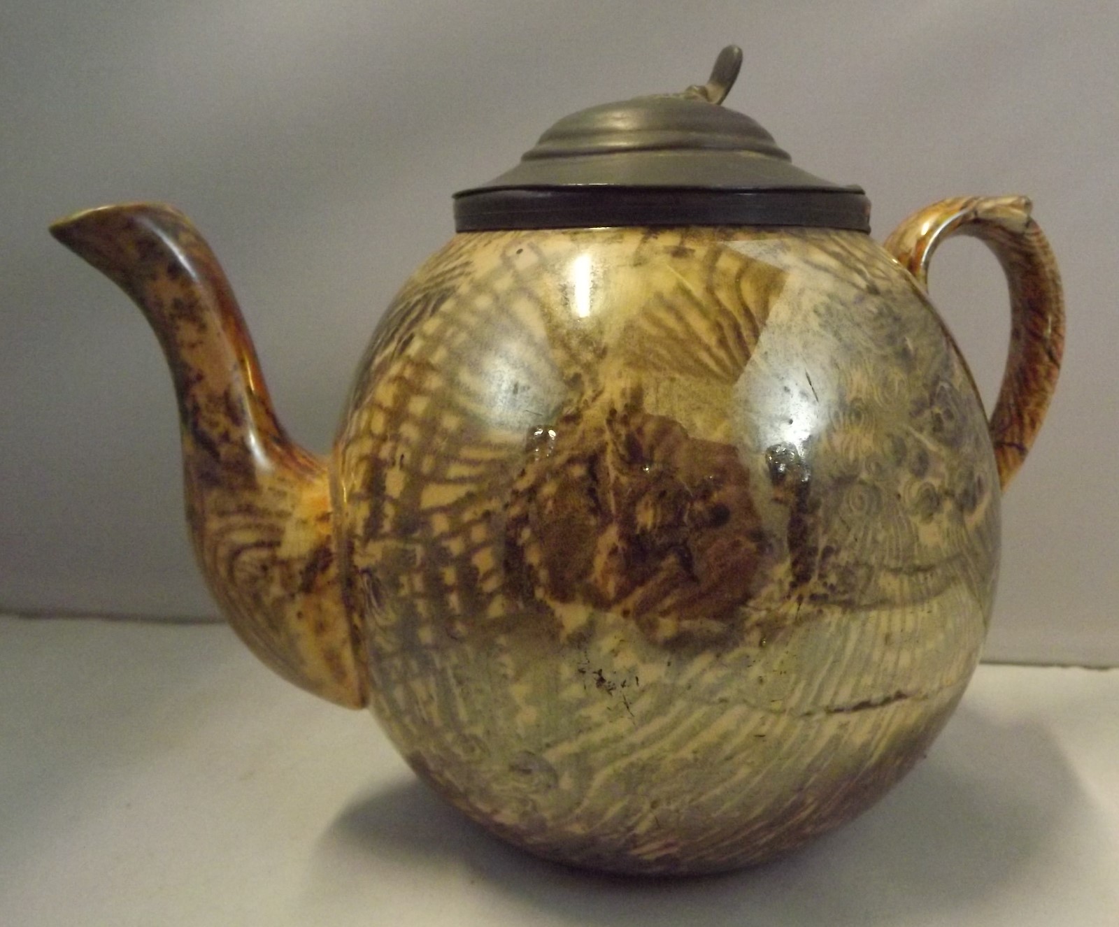 Antique Early 19th Century Slipware Teapot with Pewter Lid
