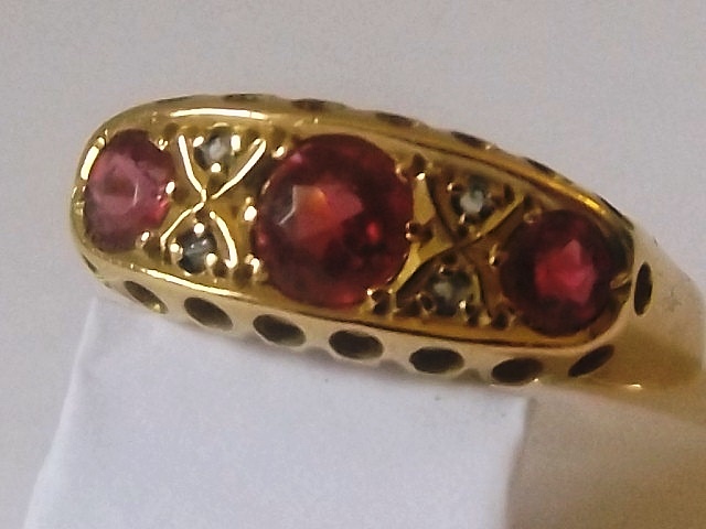 Antique Early 20th Century 18ct Yellow Gold Ruby Diamond Half Hoop Boat Ring