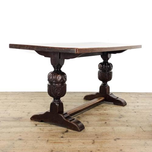 A solid and attractive early 20th-century oak refectory table. It features a rectangular plank top, raised on cup-and-cover supports with sleigh feet, and a central stretcher for added stability. Full of character, with a rich patina throughout, this piece is a striking and practical example of traditional oak craftsmanship. Item Ref; M-6435