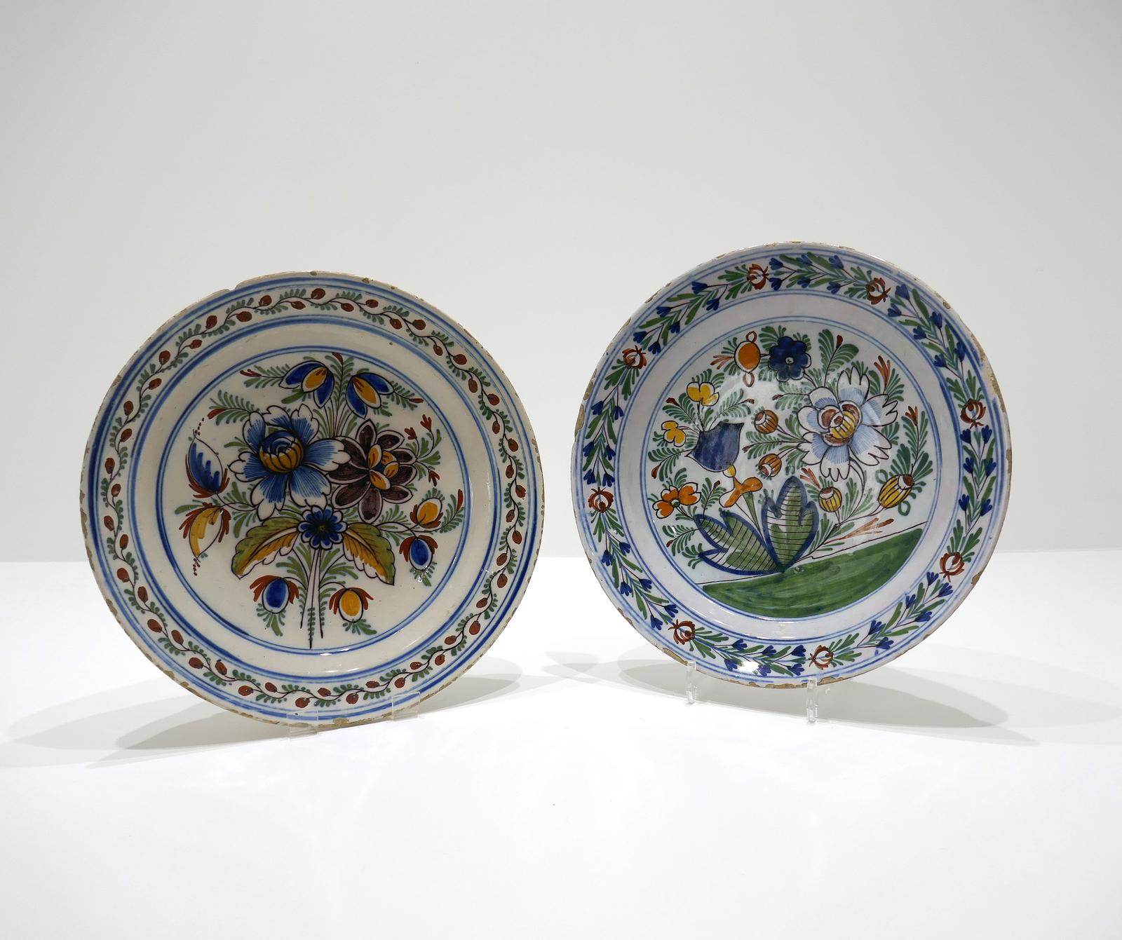 Antique 18th Century Pair of 9" Polychrome Floral Decorated Delftware Plates - Dutch 1770-1790