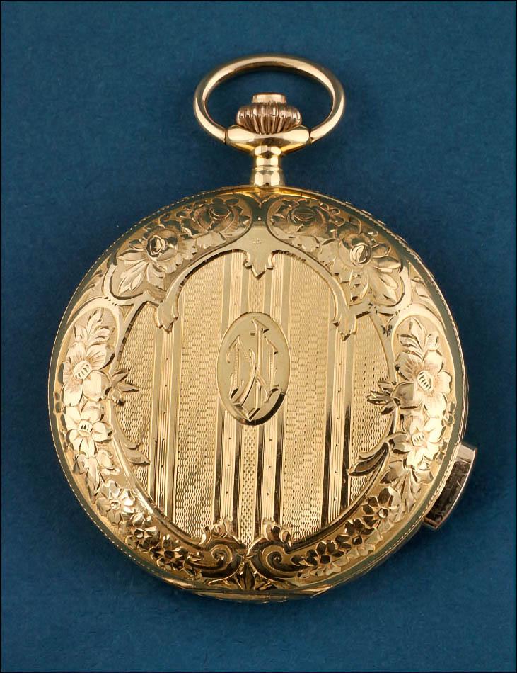 This antique Eberhard & Co. pocket watch, made in Switzerland around 1890, is a high grade watch in solid 18K gold that stands out for its excellent preservation and for the quality of its minute repeater. The case, profusely hand engraved, shows very defined floral motifs that cover both the back lid and the rim, with homogeneous and well executed workmanship. The result is an elegant, solid piece, representative of late nineteenth century Swiss watchmaking.