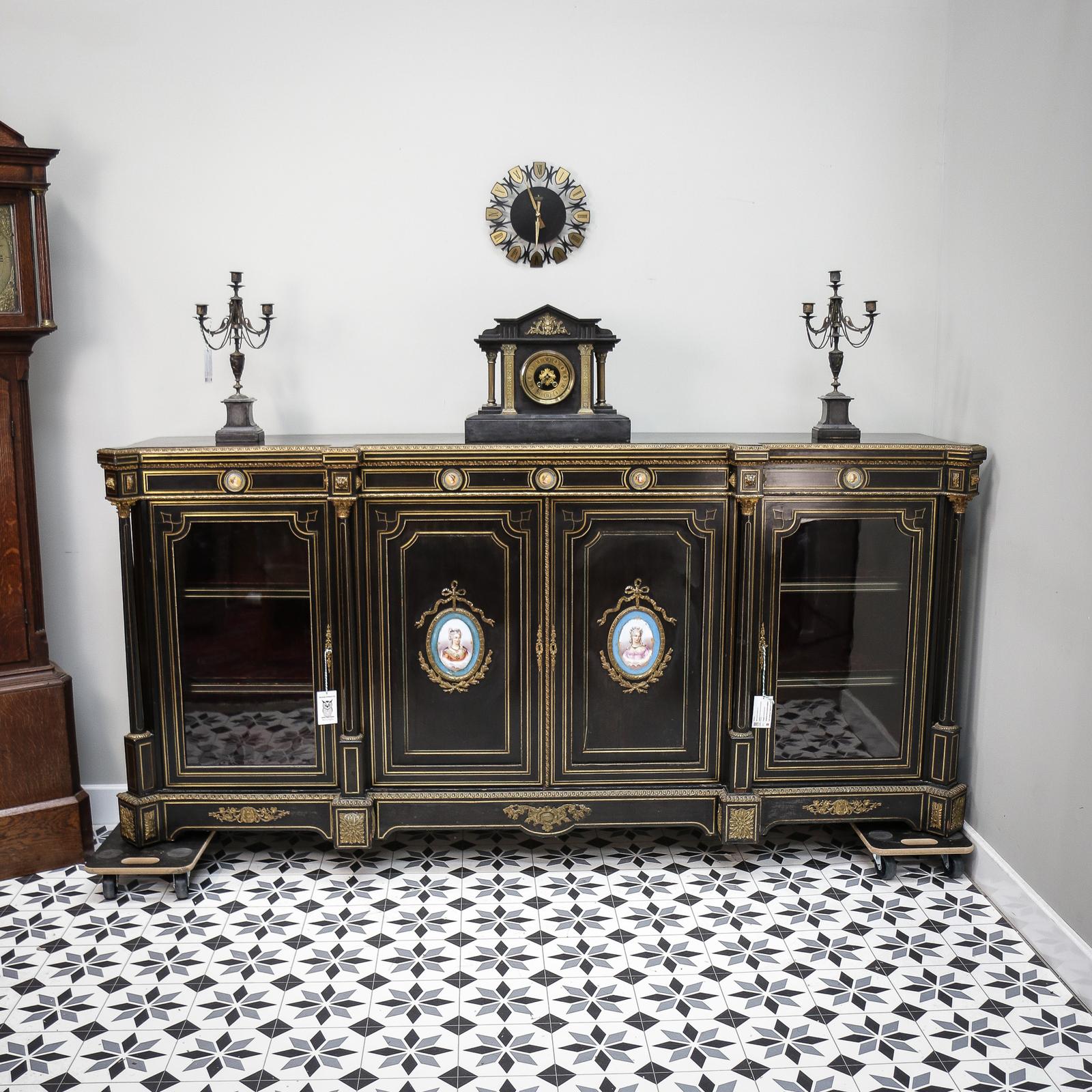 Antique Ebonised and Gilt Brass Credenza 19th Century with Porcelain Plaques