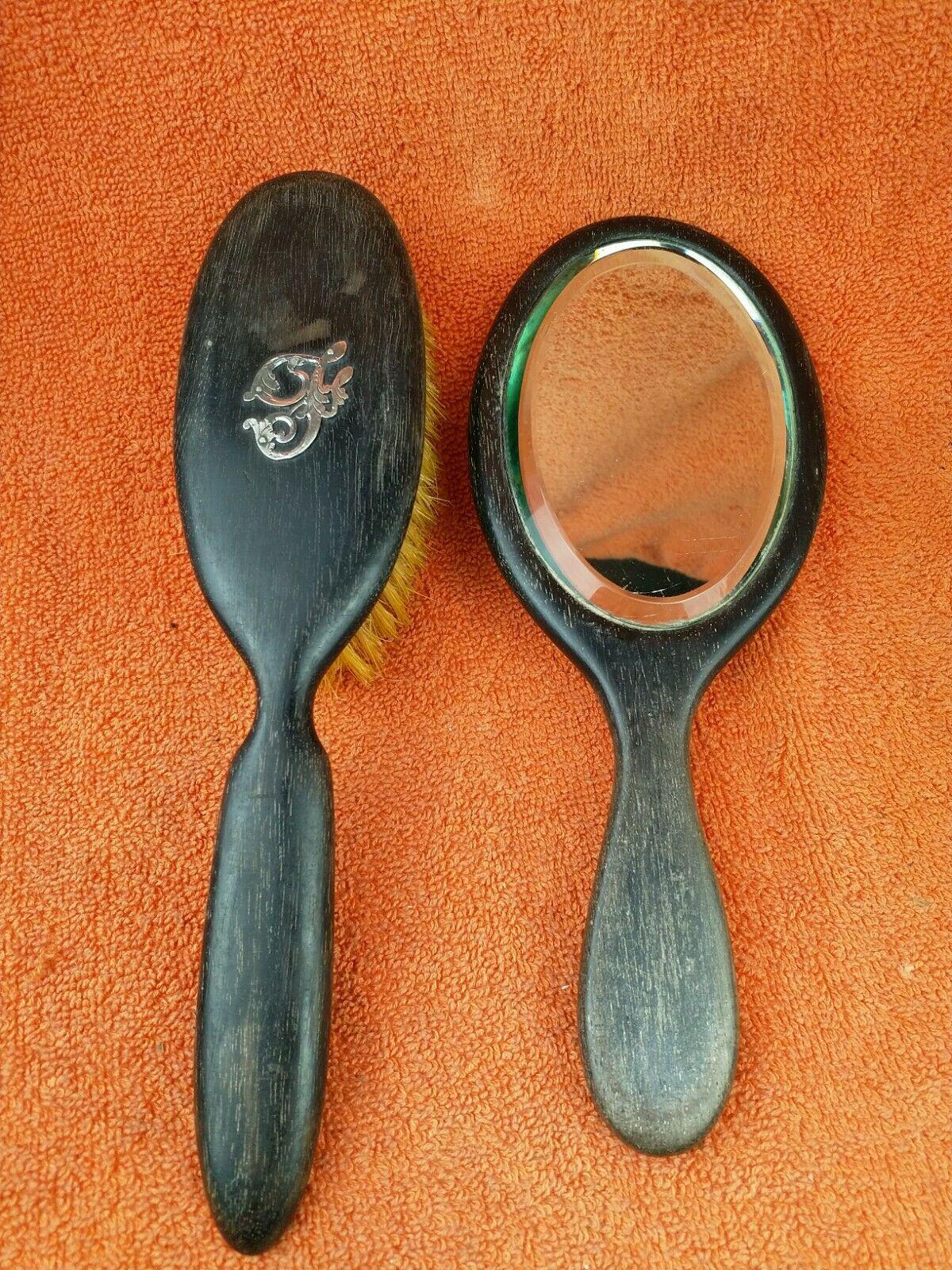 Antique Ebony Bevelled Mirror & Brush Silver "F" c.1900