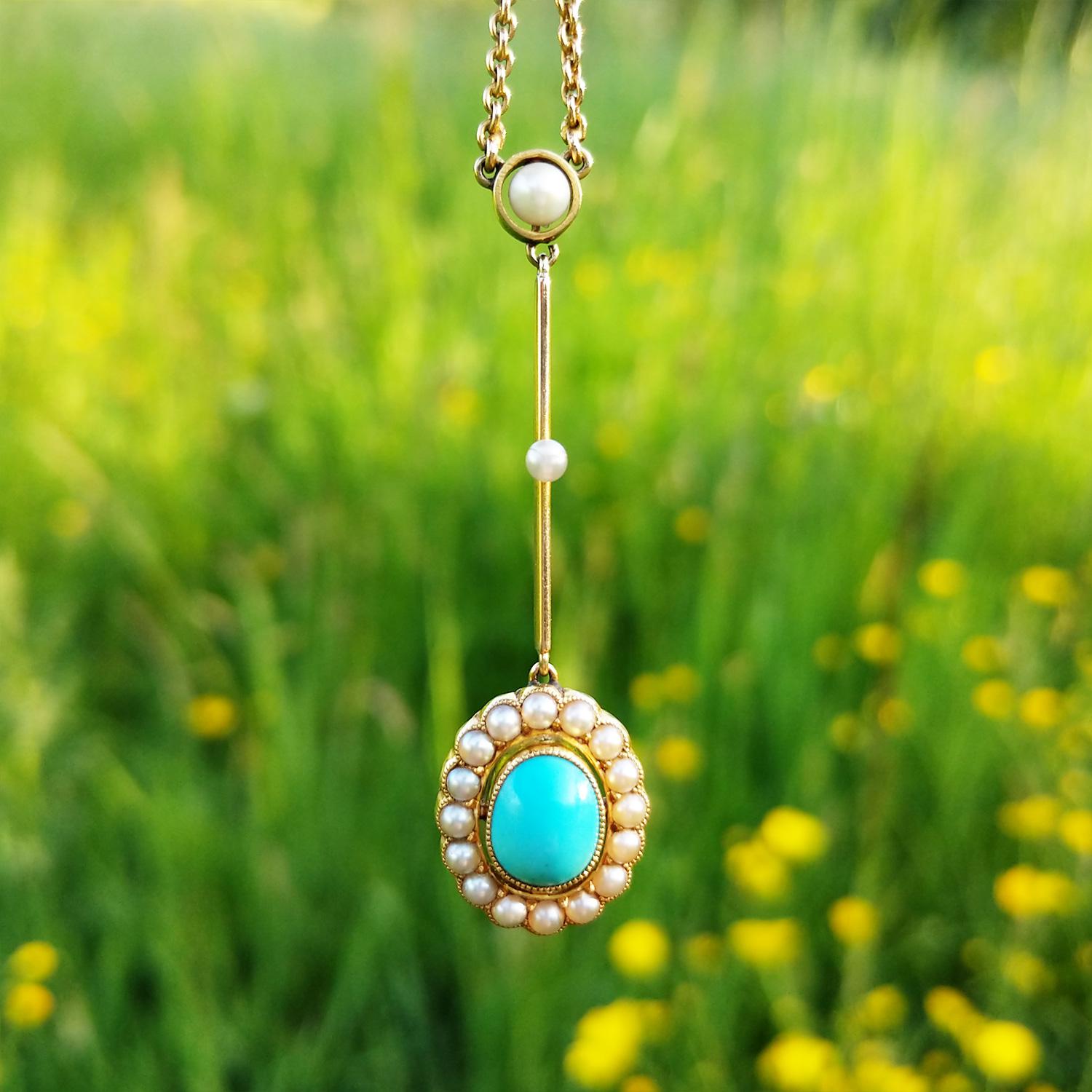 Antique Edwardian 15ct Gold Turquoise & Pearl Edna May Necklace, Vintage Pendant Necklace