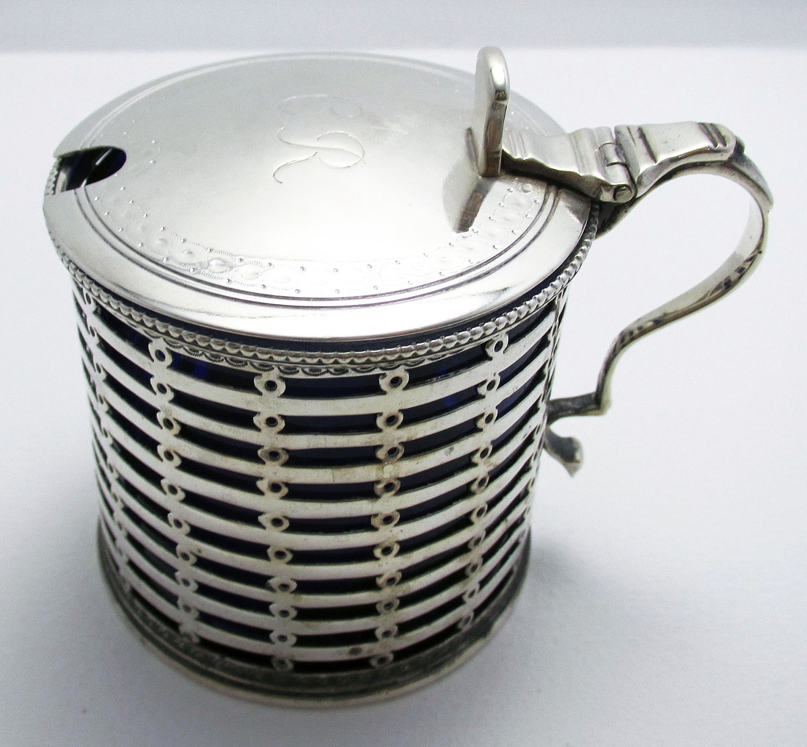 Antique Edwardian 1902 Large Solid Sterling Silver & Blue Glass Liner Pierced Mustard Pot Cruet. English Hallmarked