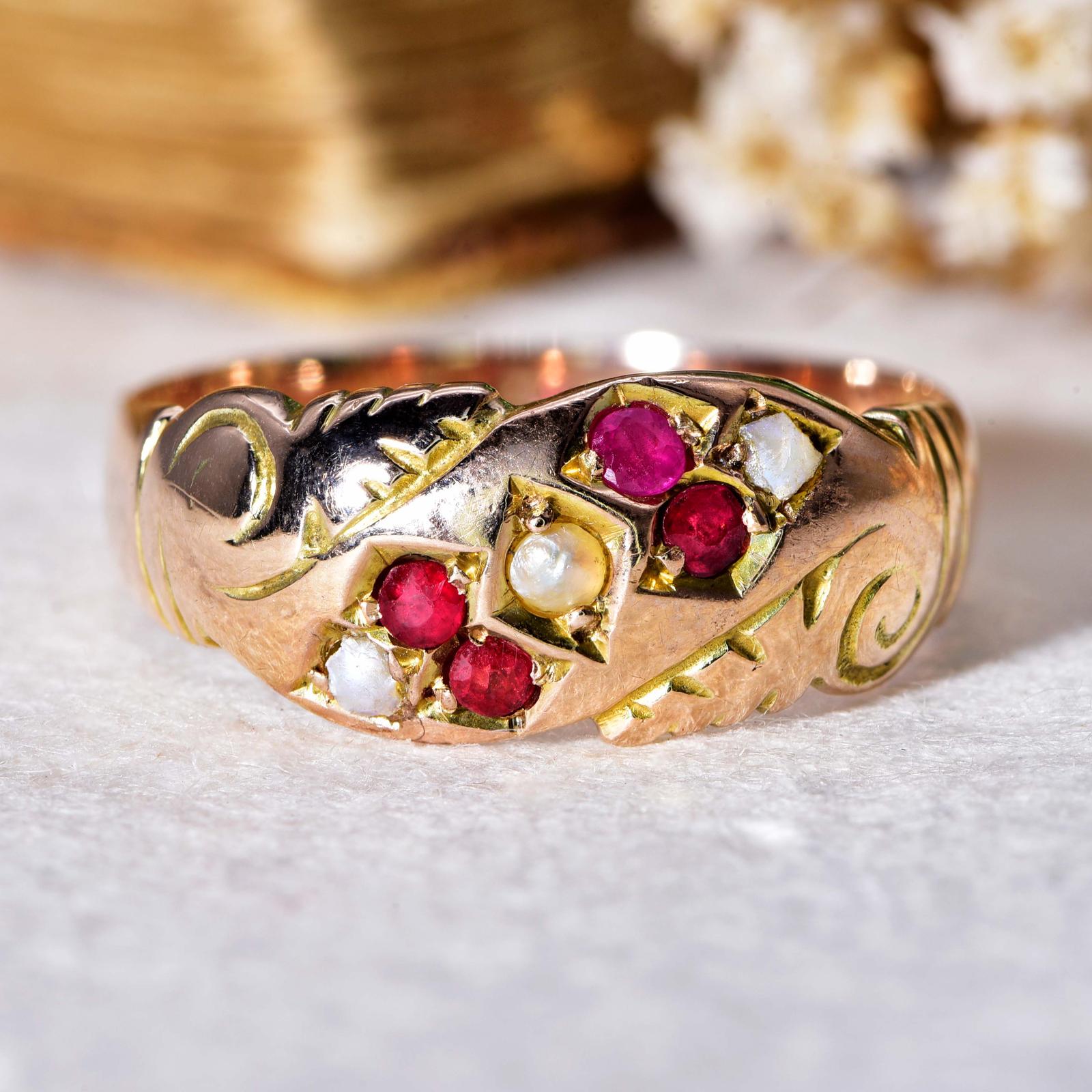 Antique Edwardian 1902 Pearl and Ruby Scroll Ring