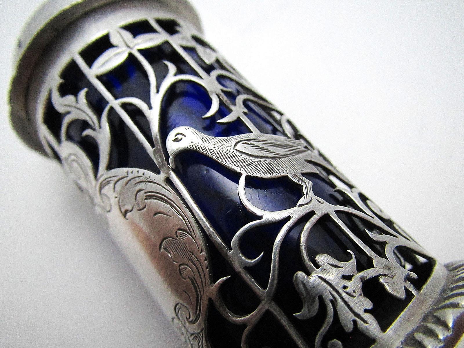 Antique Edwardian Sterling Silver & Bristol Blue Glass Liner Pierced Pepper Pot Shaker, Sheffield 1914