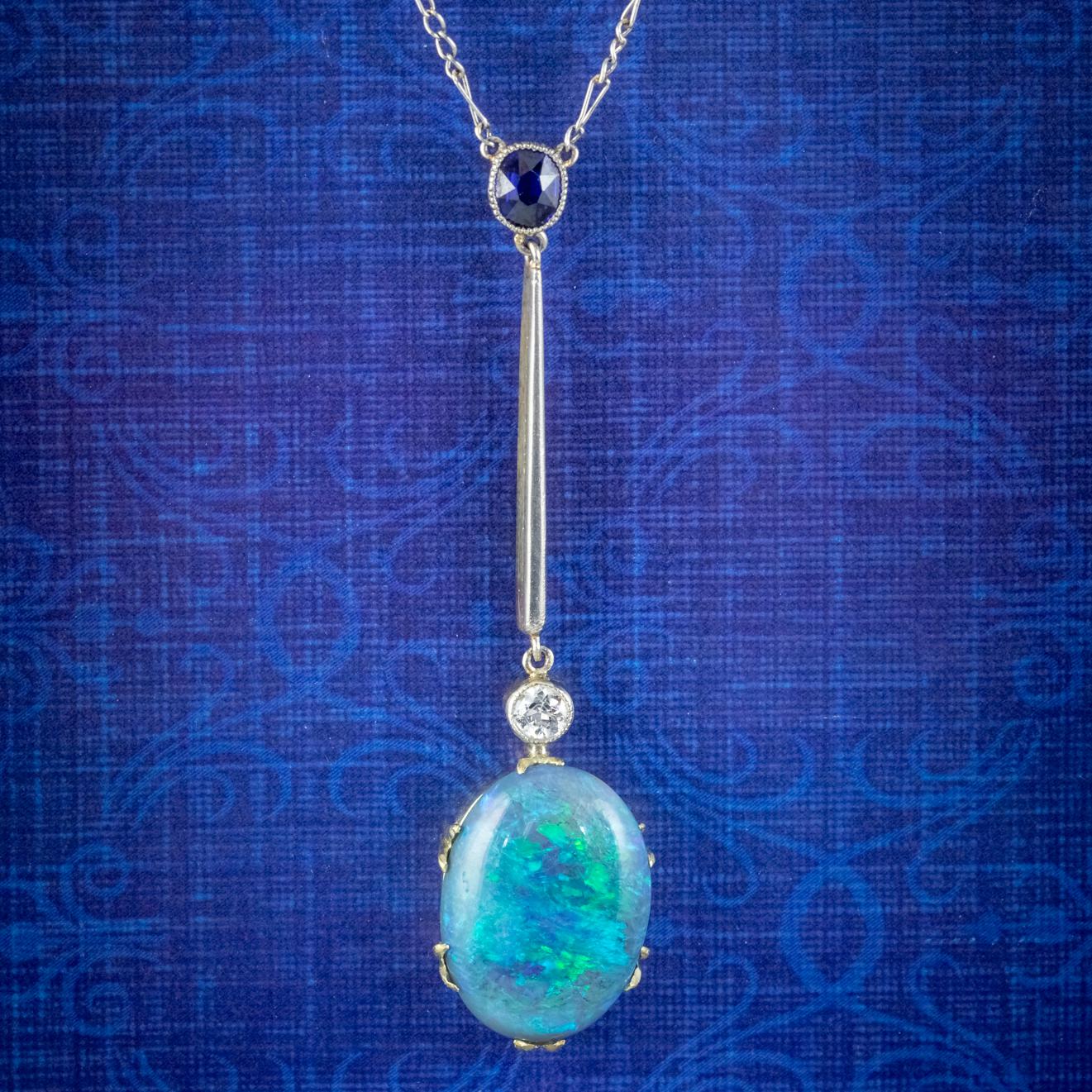 Antique Edwardian 7ct Black Opal Diamond Sapphire Lavaliere Necklace 18ct Gold Platinum Circa 1905