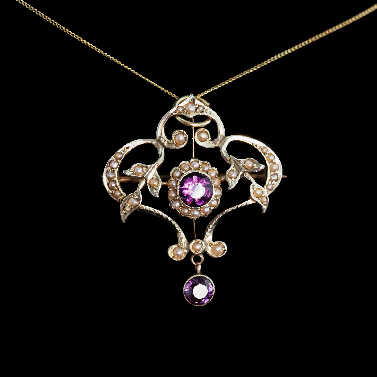 Antique Edwardian 9ct Gold Seed Pearl & Purple Amethyst-coloured Paste Pendant Necklace (1 of 15)