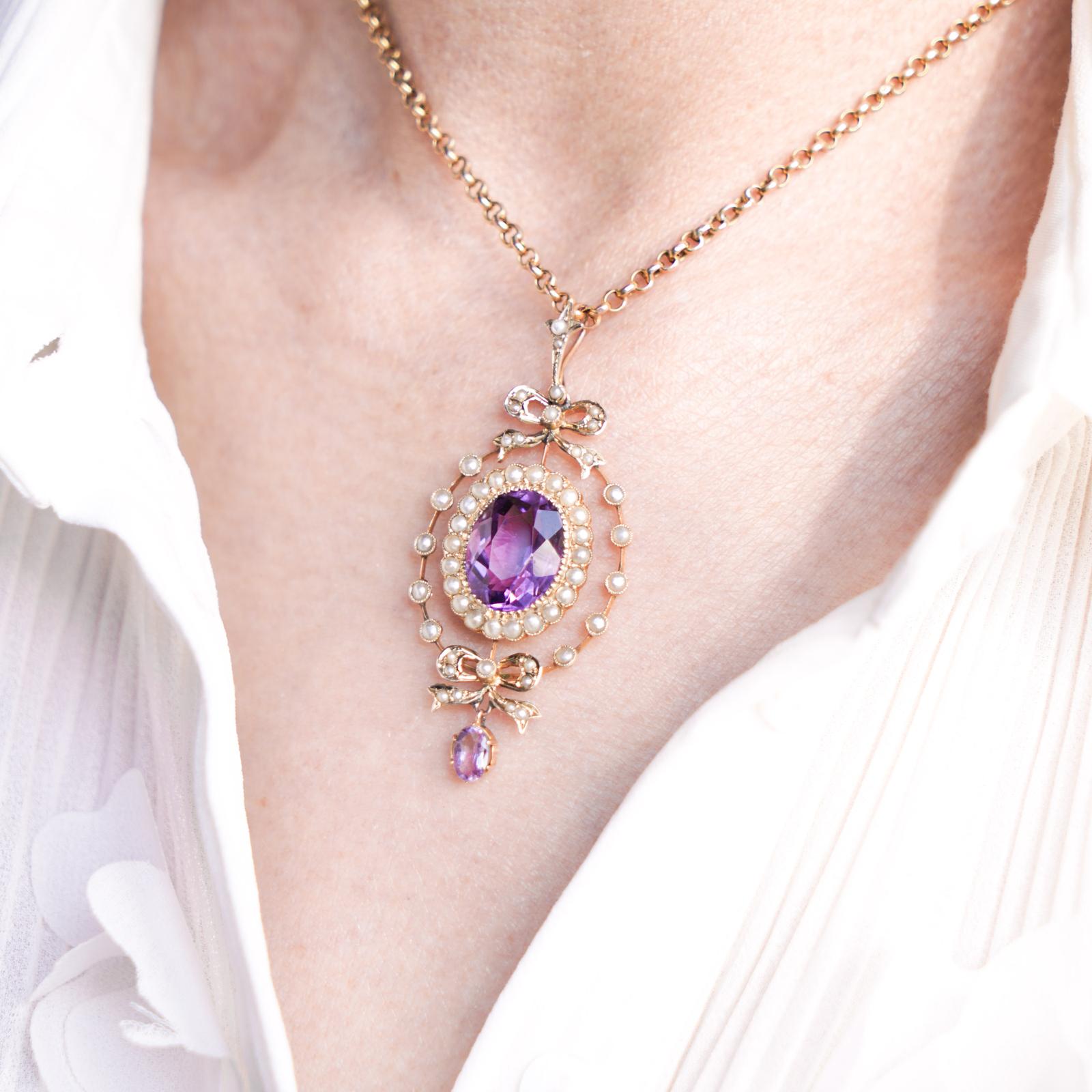 Antique Edwardian Amethyst & Seed Pearl 9ct Gold Necklace Pendant c.1905