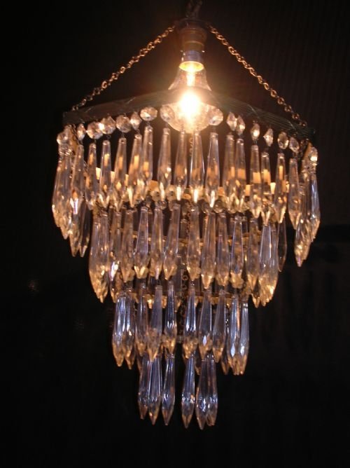 Antique Edwardian Brass & Crystal Hanging Hall Lantern Chandelier Light
