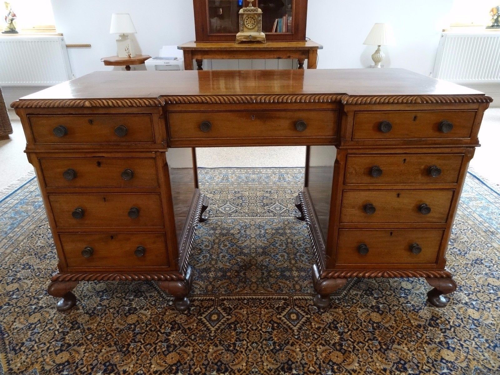 Antique Edwardian Chippendale Mahogany 9 Drawer Partners Writing Desk / Table