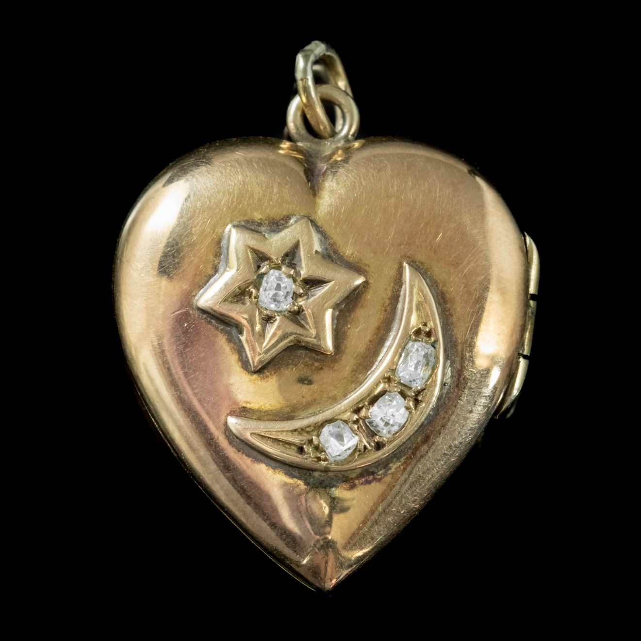 Antique Edwardian Diamond Heart Locket Crescent Star 18ct Gold Dated 1909