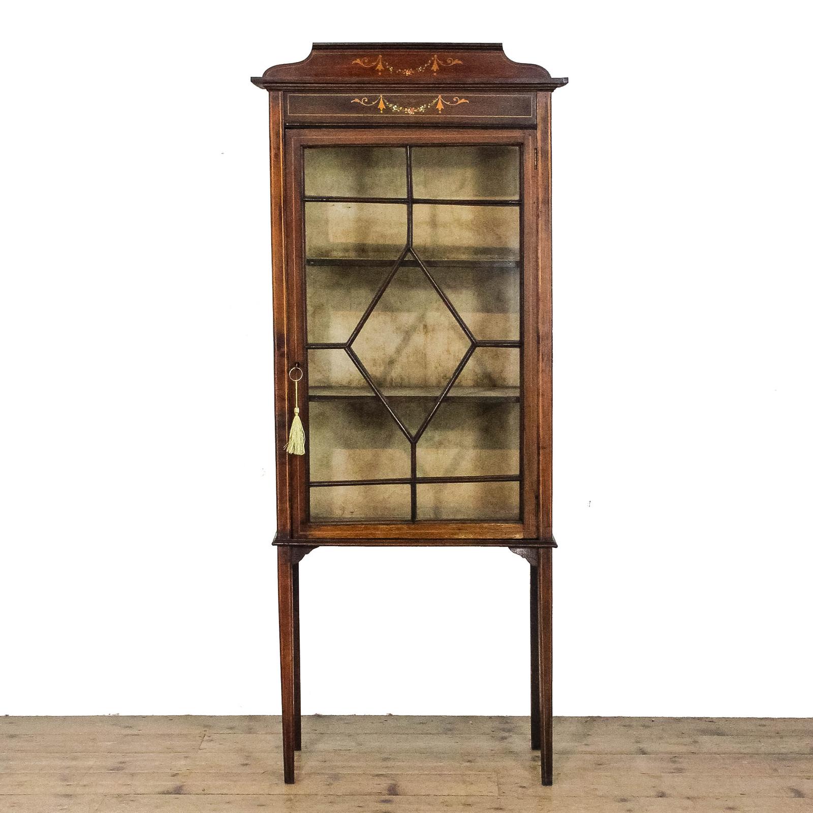 An attractive small Edwardian antique mahogany display cabinet, having a shaped back with painted and inlaid decorative detail to the frieze. The cabinet features a glazed door with geometric astragal bars opening to a fabric-lined interior with two fixed shelves. Raised on slender square tapering legs, this is a neat and decorative cabinet with plenty of character.