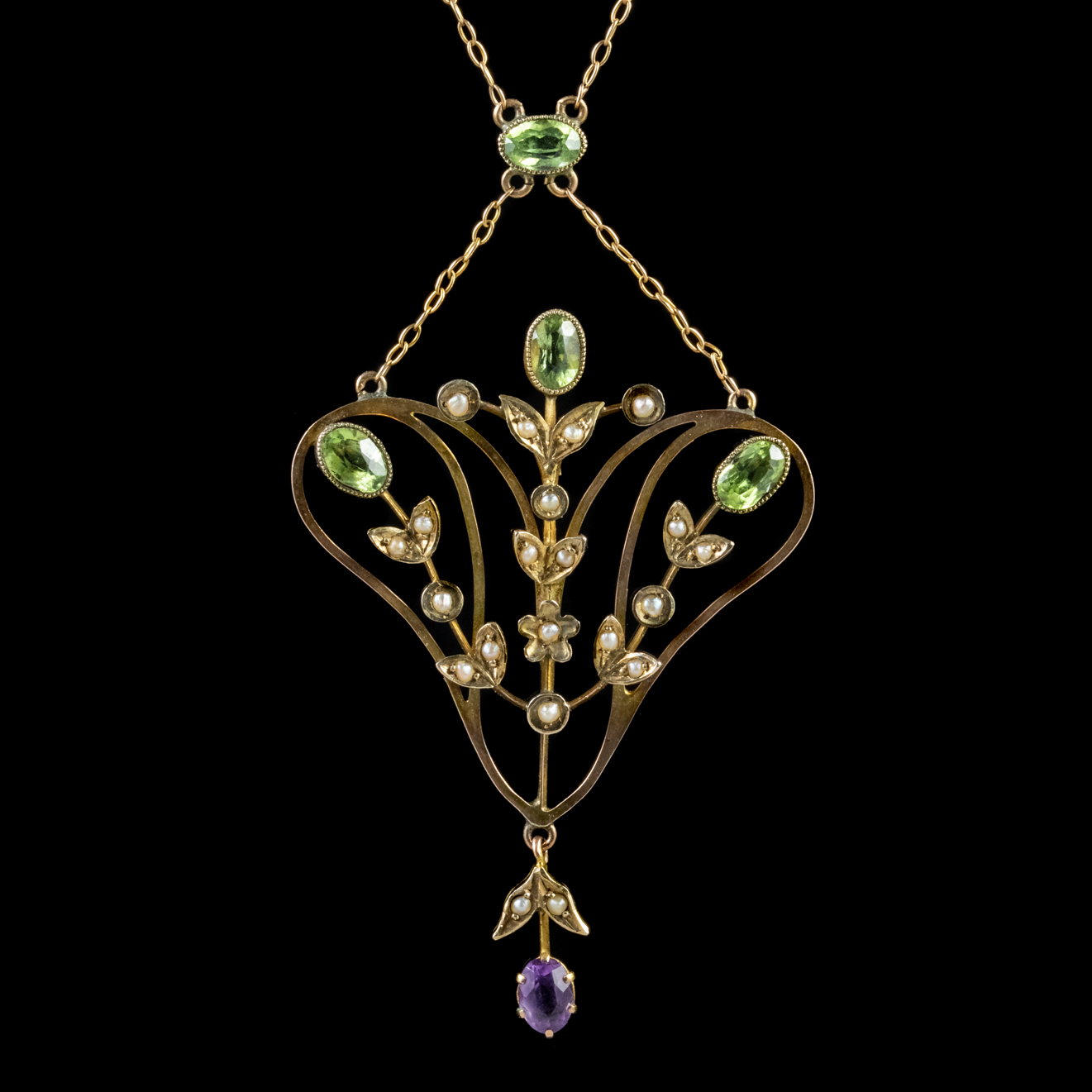Antique Edwardian Floral Suffragette Pendant Lavaliere Necklace 9ct Gold c.1910