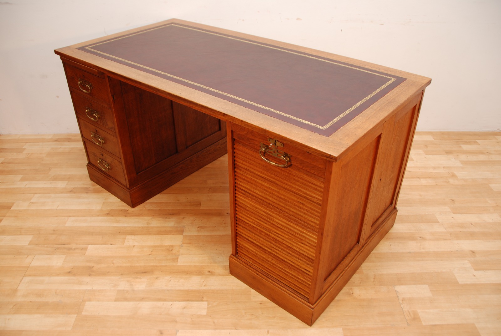 Antique Edwardian Golden Oak Writing Pedestal Writing Desk with Tambour