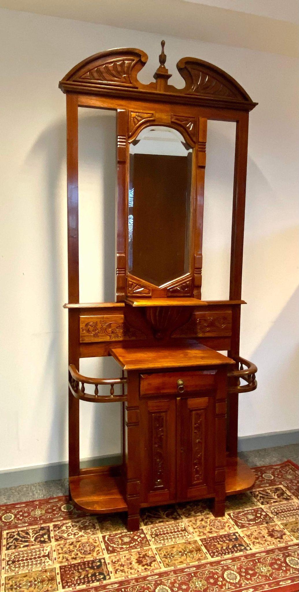 Antique Edwardian Hall Stand With Mirror - Carved Detailing - Mahogany Wood - c.1900-1920