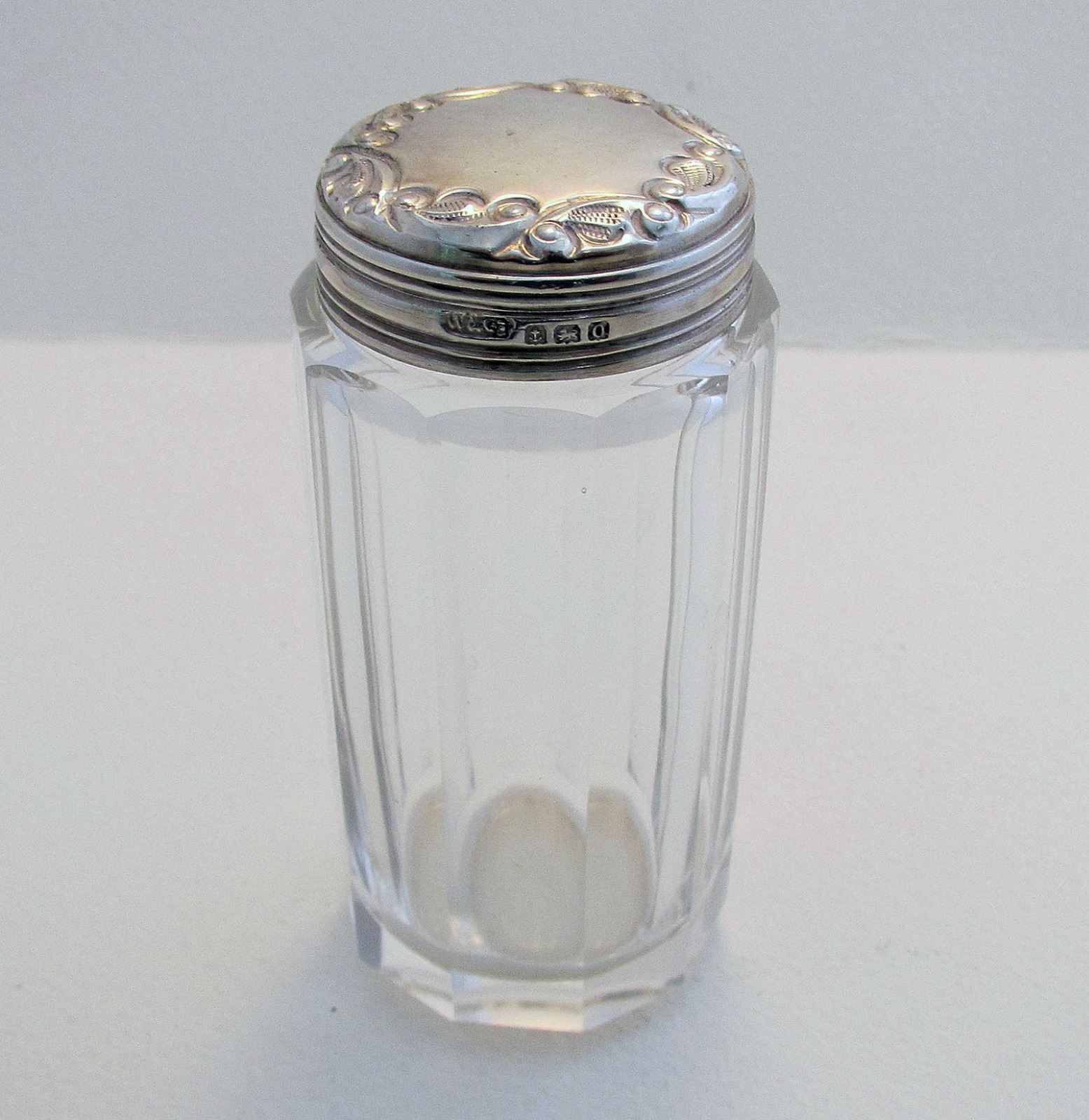 Antique Edwardian Hallmarked Solid Sterling Silver English Dressing Table Top Lidded & Cut Glass Bottle / Jar / Pot / Container 1909