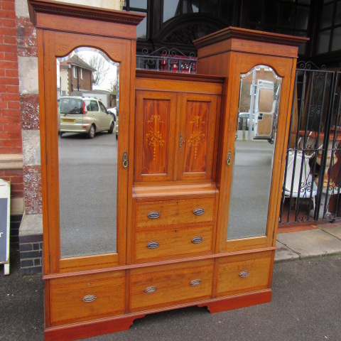 Antique Edwardian Inlaid Mahogany Triple Wardrobe