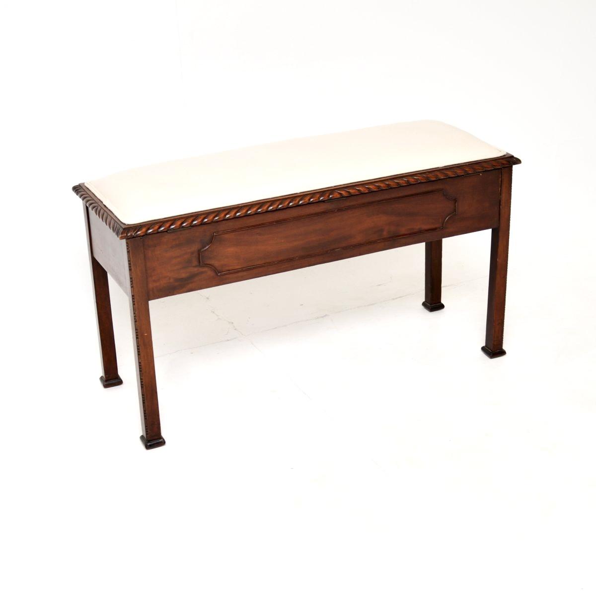 A smart and useful antique Edwardian mahogany duet piano stool / bench. This was made in England, it dates from around the 1900-1920 period. It is of lovely quality and is a great size, perfect for use at the end of a bed, in an entry way or a bay window. The frame is beautifully made from solid mahogany with panelled sides, it is identically finished front and back. The top of the seat has gadrooned carving, it lifts up to reveal internal storage space. We have had this re-polished and re-upholstered in a cream cotton fabric, the condition is great for its age. There is just some minor wear and patina, with a few small knocks to the beading around the panels, seen in the images. Width – 38 inches , 97 cm Depth – 14 inches , 36 cm Height – 21 inches , 53 cm